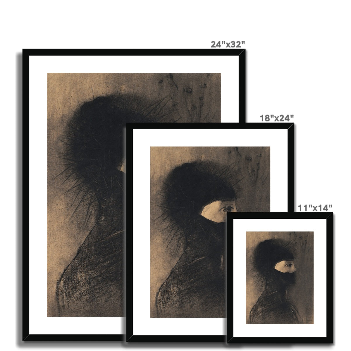 The piece "Armor" by Odilon Redon, dating from around 1891, is a study in contrasts and textures that evokes a sense of mystery and introspection. The image is dominated by a profile view of a figure, partially obscured by what appears to be a dark, textured helmet or headpiece, which could be interpreted as armor. The use of shadow and light is stark, highlighting the figure's eye and giving depth to the image. The somber tones and the obscured face suggest themes of isolation, protection, or perhaps the concealment of one's true identity. Redon's work often delves into the realm of the imagination and the subconscious, and this piece may reflect those interests, offering a visual metaphor for psychological depth and complexity.