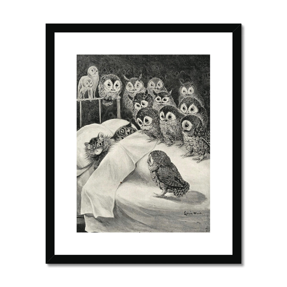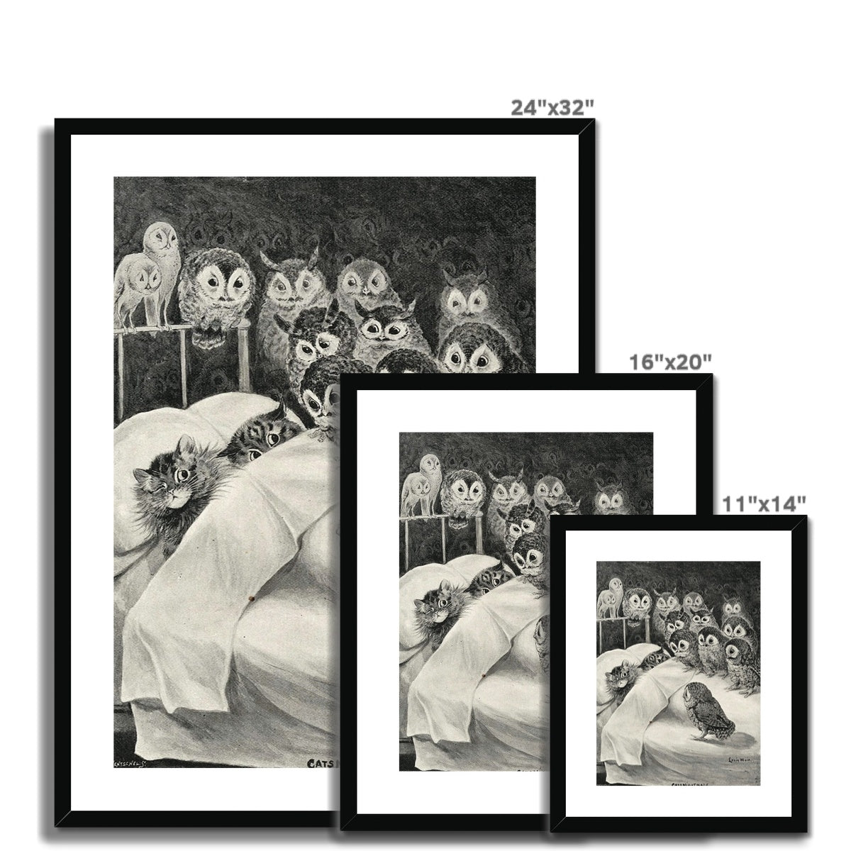 The illustration titled Cat's Nightmare by Louis Wain, circa 1890, depicts a surreal and humorous scene in which a startled cat lies in bed surrounded by a large group of wide-eyed owls. The owls crowd around the bed, perched on its frame and covering the blanket, their large, intense eyes conveying curiosity or mischief. The cat's expression of alarm and bewilderment contrasts with the uniform and calm demeanour of the owls, adding an eerie yet whimsical quality to the artwork. The monochromatic illustration blends fine detailing and imaginative composition, characteristic of Wain's unique style.