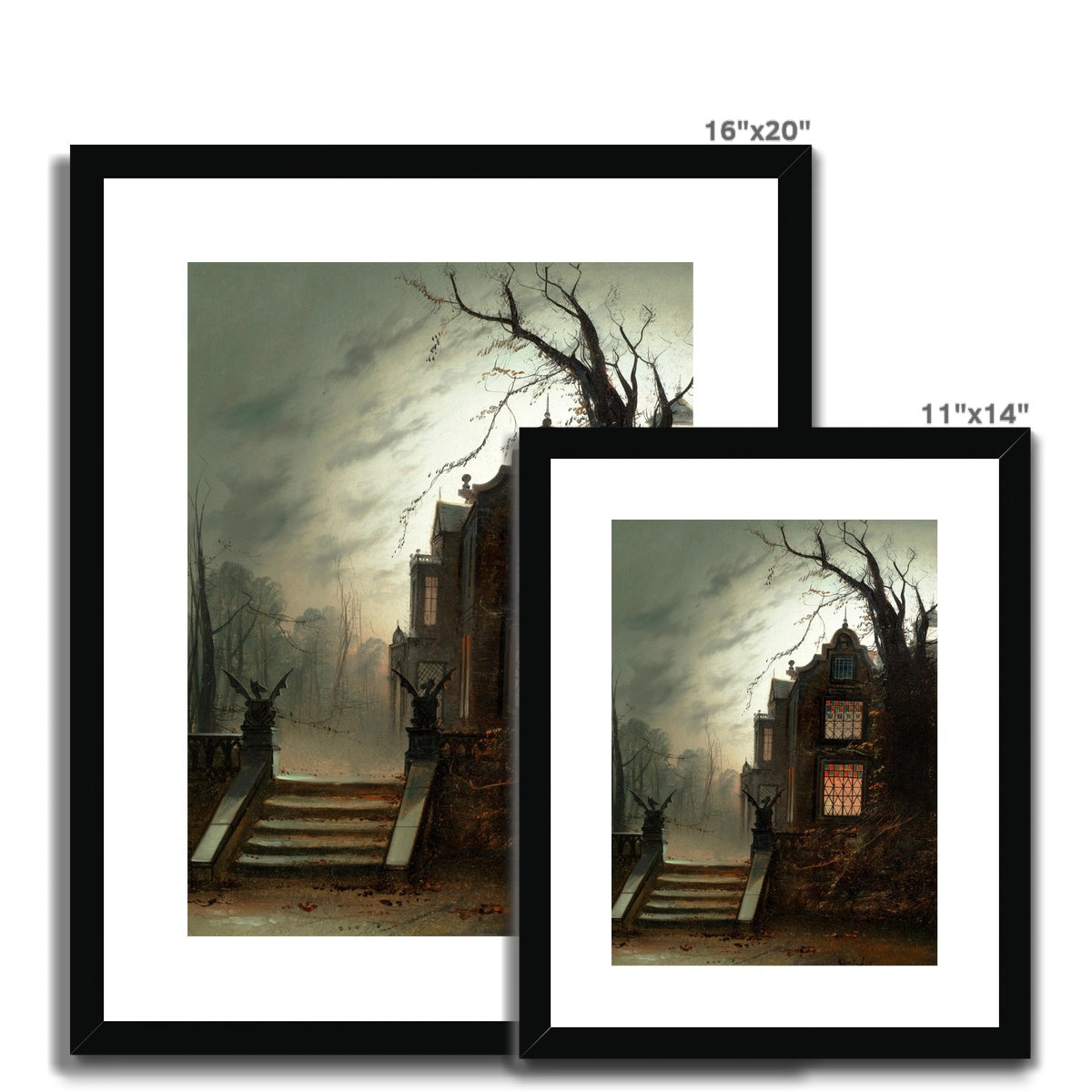 This painting titled "Country House in Moonlight" by Wilfred Bosworth Jenkins depicts a stately home at dusk or night, illuminated by the soft, ethereal glow of the moon. The architecture of the house suggests a period style, possibly Victorian, with ornate windows and a classic façade. A large, leafless tree leans towards the house, contributing to the slightly eerie atmosphere of the scene. The foreground features a staircase flanked by stone balustrades, topped with statues that may depict mythical creatures or gargoyles, leading down to what appears to be a garden or parkland.