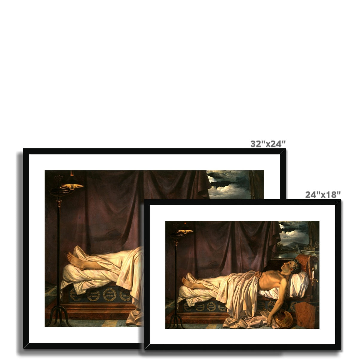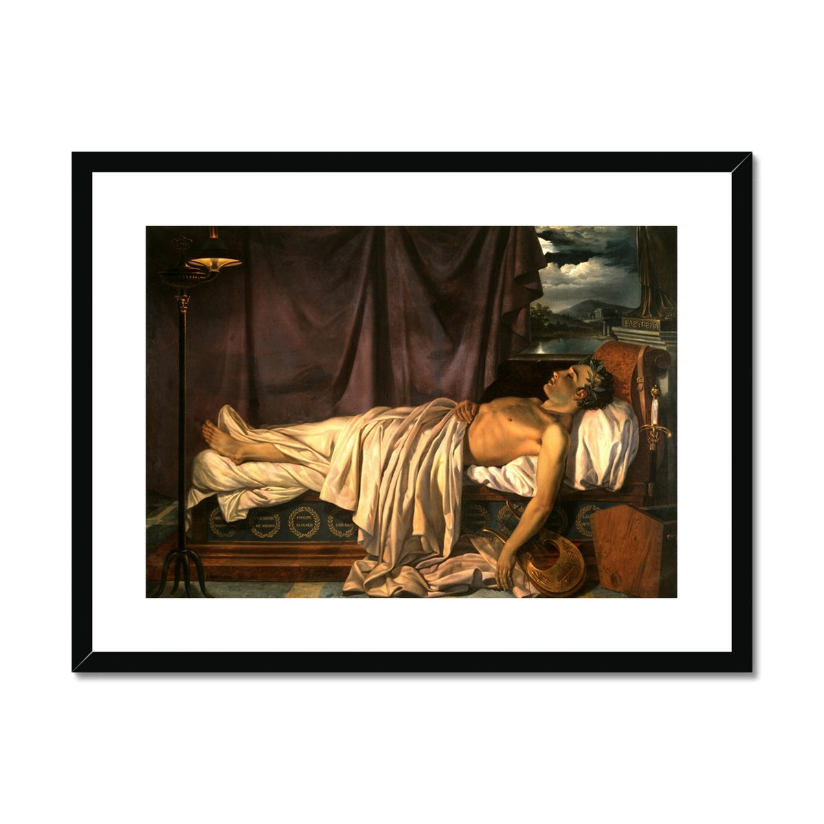 This framed print of Joseph Denis Odevaere's "Lord Byron on his Death Bed" from 1826 is a timeless classic. It is crafted from top-quality materials and finished with a durable protective coating, making it a perfect addition to any home or office décor. The canvas print is sure to stand the test of time and bring an air of sophistication to any setting.