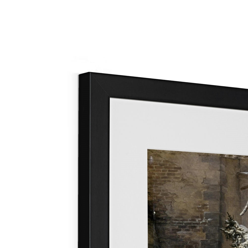 Carl Friedrich Lessing’s Monastery Courtyard in Snow (1829) depicts a quiet cloister blanketed in winter’s stillness. Snow-covered trees and stone figures frame the entrance to the monastery, where faint candlelight and shadowed monks suggest solemn devotion. The painting balances serene natural detail with the austere architecture, evoking both spiritual contemplation and the silence of winter.