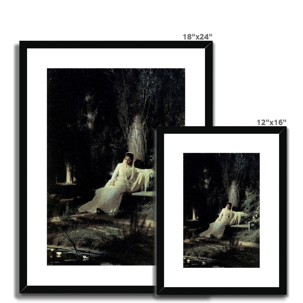 Ivan Kramskoi’s "Moonlit Night" (1880) presents a poetic meditation on solitude and introspection. Bathed in silvery moonlight, a woman in elegant white attire reclines thoughtfully on a garden bench, her figure glowing softly against the dense, shadowed foliage. Kramskoi masterfully contrasts luminosity and darkness, heightening the sense of quiet contemplation and emotional depth. The serene pond and delicate flowers further enhance the nocturnal atmosphere, revealing a scene where nature, light, and human presence merge into a moment of reflective stillness.