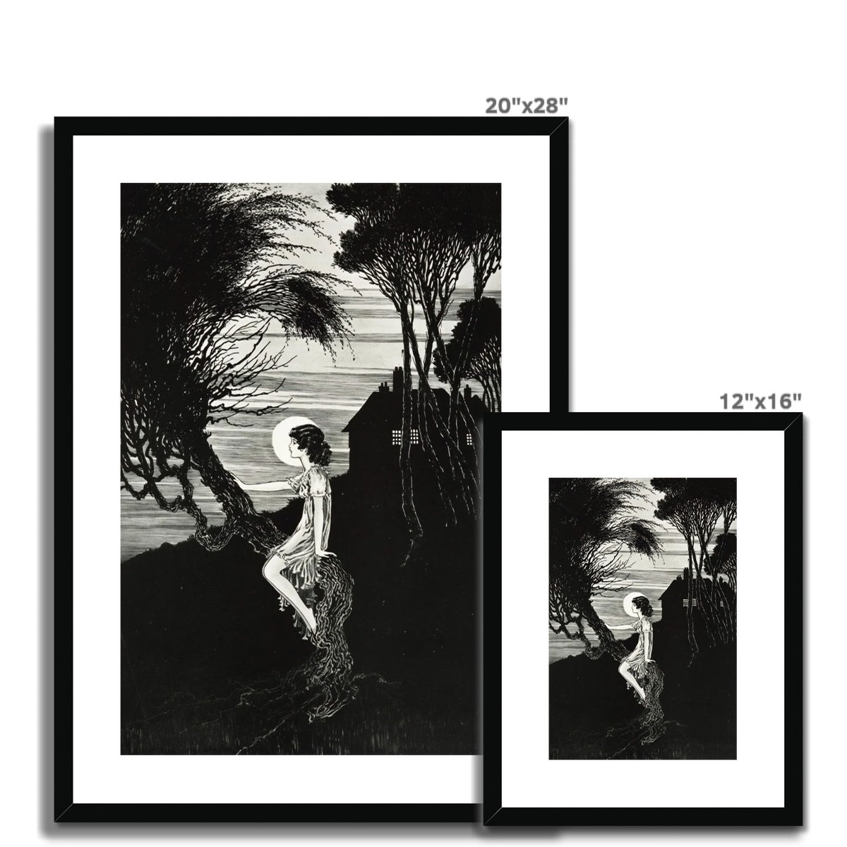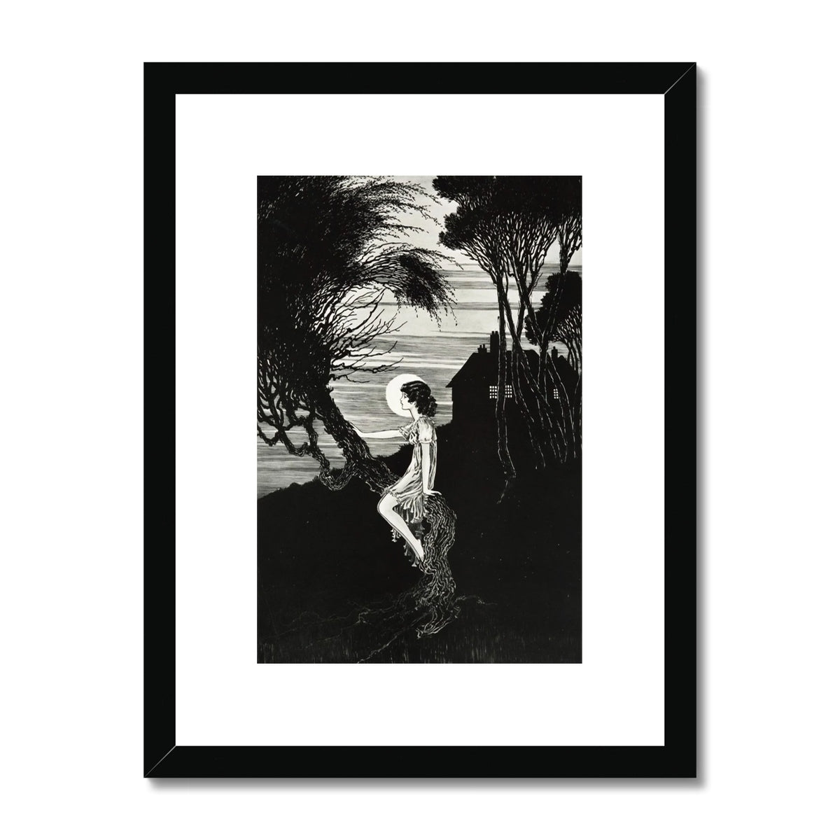 Moonrise (ca. 1919) by Ida Rentoul Outhwaite is a delicate black-and-white illustration that captures a dreamlike nocturnal scene. A young woman in a flowing dress sits gracefully upon a twisted tree, while a rising moon glows behind her. The silhouetted house and trees create a mysterious, fairy-tale atmosphere, balancing innocence with quiet enchantment.
