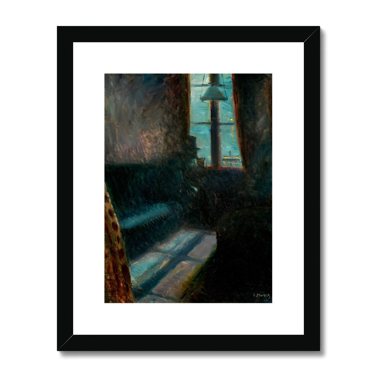 "Night in Saint-Cloud" (1890) by Edvard Munch is a moody, atmospheric painting that captures a quiet, introspective interior scene. Bathed in deep shadows, the room is dimly lit by the soft blue glow of moonlight filtering through a tall window. A solitary figure, barely visible, sits beside the window, immersed in contemplation. The painting's expressive brushwork and somber palette reflect Munch's early exploration of psychological depth and emotional solitude, themes that would later define his Symbolist style.