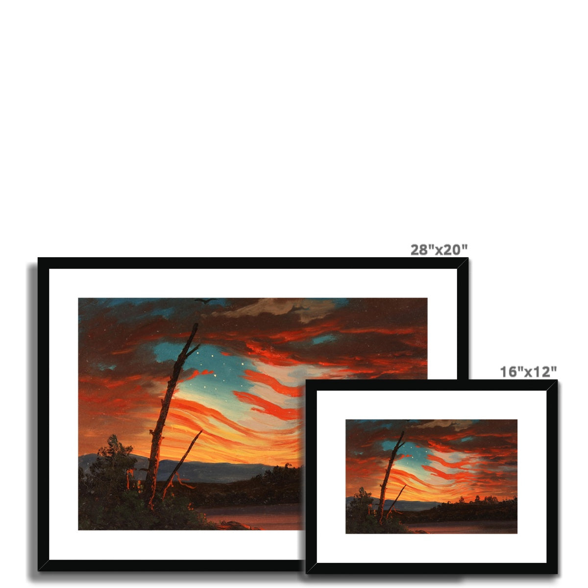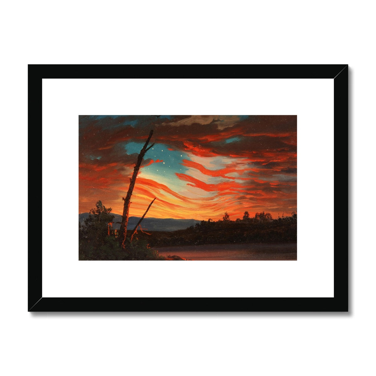 "Our Banner In The Sky" by Frederic Edwin Church, painted circa 1861, is a striking and patriotic piece of art. This painting captures a vibrant sunset with dramatic red and orange hues streaking across the sky, mimicking the stripes of the American flag. Against the backdrop of a darkening blue sky, the stars begin to shine through, resembling the star field of the flag. A tree stands in the foreground, its broken and leafless branches silhouetted against the sky, forming what appears to be a flagpole against the natural elements. Below, the landscape is cast in shadow, suggesting the onset of evening. This work is an allegory of hope and resilience during the tumultuous times of the American Civil War, using the sublime beauty of nature to echo the national sentiment.