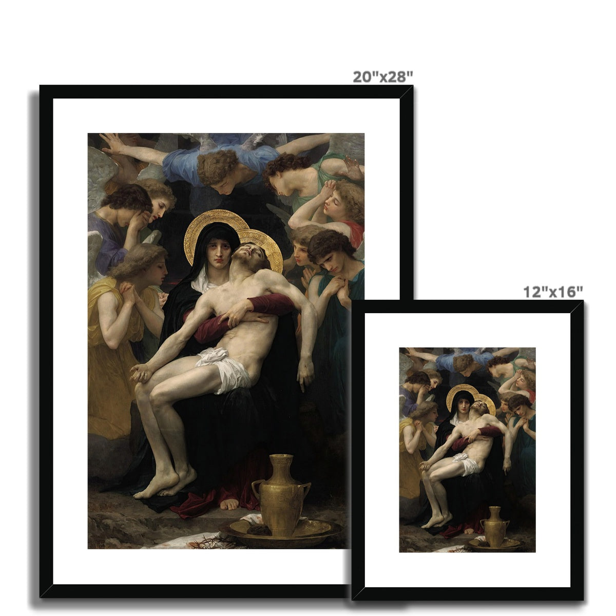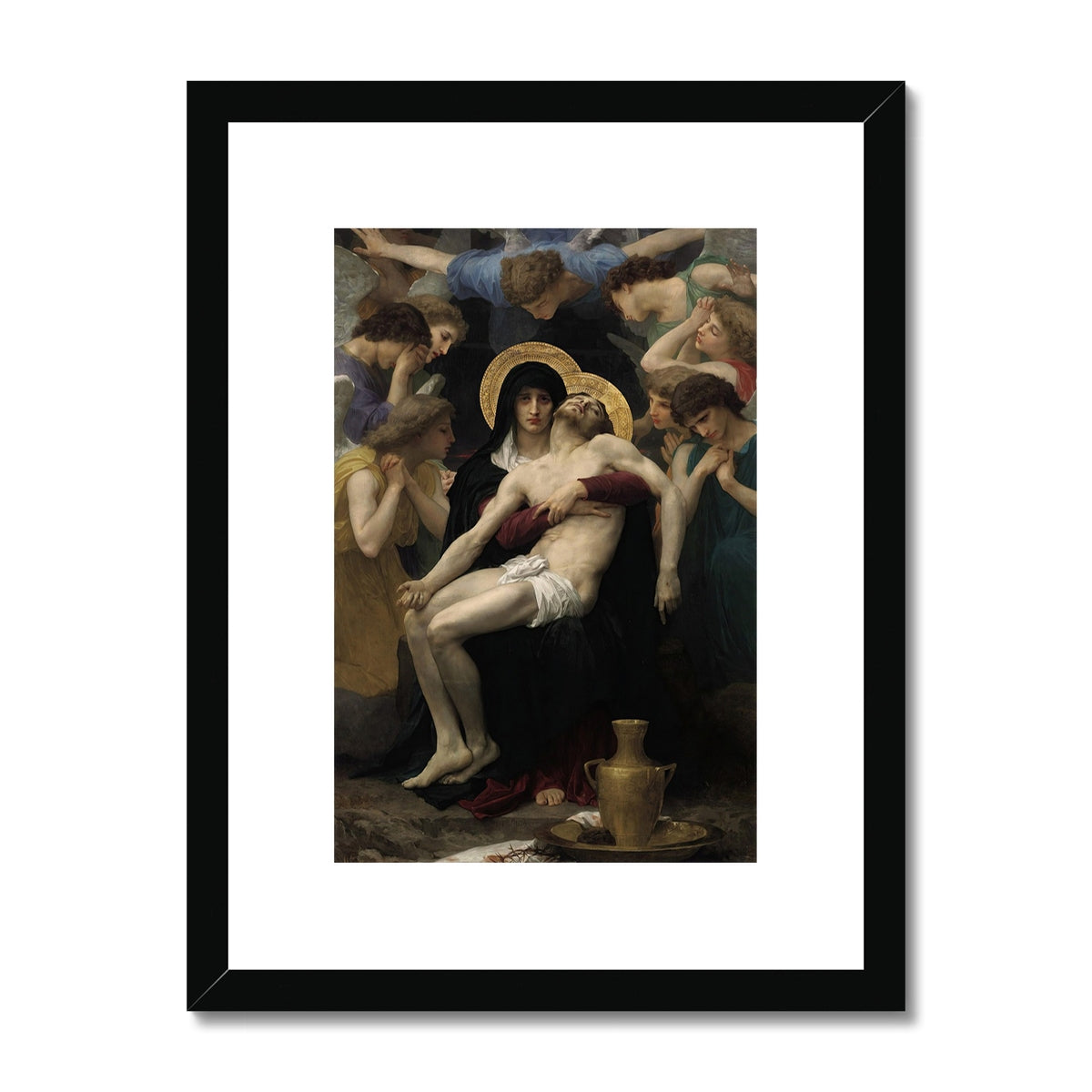 This painting, titled "Pietà," was created by William-Adolphe Bouguereau in 1876. It depicts the Virgin Mary cradling the lifeless body of Jesus Christ after his crucifixion, a poignant moment of mourning and sorrow. Mary is surrounded by grieving angels, their faces reflecting deep sadness. The composition is both serene and emotionally charged, with the figures rendered in Bouguereau's characteristic smooth and realistic style. The gold halos around Mary and Jesus emphasize their sanctity, while the careful use of light and shadow enhances the somber atmosphere of the scene, focusing attention on the tender interaction between mother and son.