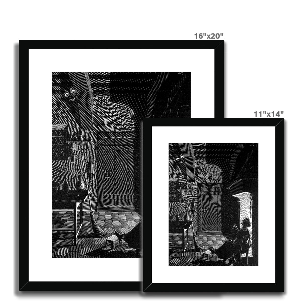 This illustration captures an eerie, supernatural moment inside a rustic interior. A woman sits in a chair, startled, as intense light and energy emanate from a roaring fireplace, casting sharp, dramatic shadows across the room. Above, in the rafters, a sinister, grinning face watches from the darkness, heightening the sense of unease. Escher’s masterful use of line and contrast creates a vivid, haunting scene filled with mystery and psychological tension.