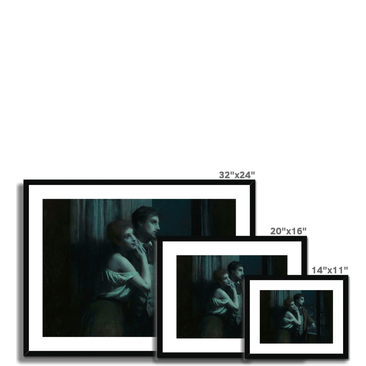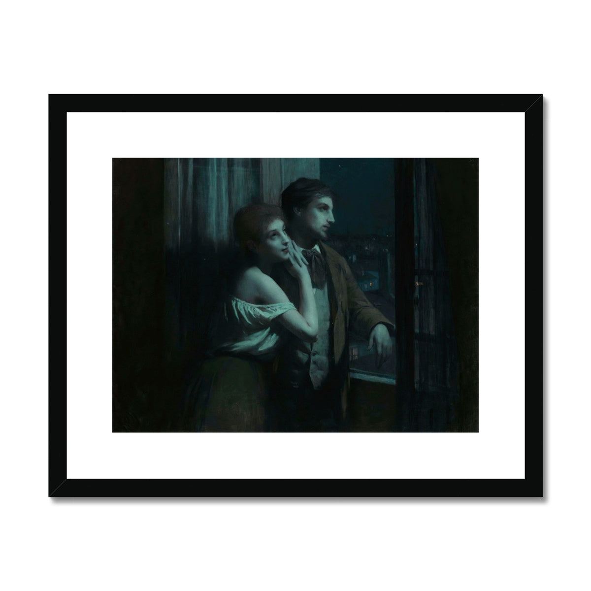 In this intimate nocturne, Lenoir captures a tender moment between a young couple gazing dreamily out of a moonlit window. Bathed in soft, bluish tones, the woman leans gently against the man, her expression filled with wonder and longing, while he looks pensively into the night. The warm glow of distant city lights contrasts with the quiet stillness inside, evoking a sense of romantic introspection and shared dreams beneath a starlit sky.