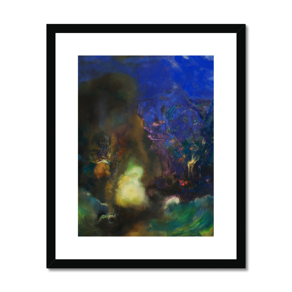 "Roger and Angelica" by Odilon Redon, created around 1910, is a vibrant work that encapsulates the fantastical elements of the narrative it depicts. The piece is inspired by the poem "Orlando Furioso" by Ludovico Ariosto, where the knight Roger saves the maiden Angelica from a sea monster. Redon's interpretation is a dreamlike vision that captures the dramatic moment of rescue. The painting is characterized by its vivid colors and swirling composition, creating a sense of movement and emotional intensity. Redon’s use of color and form abstracts the figures and the scene, giving the impression of a fleeting, mystical encounter. The dramatic contrast between the dark and light elements, as well as the use of saturated blues, suggests both the danger present and the miraculous nature of the event. This artwork is a quintessential example of Redon's symbolist approach, where the subject matter is conveyed through a powerful and personal visual language.