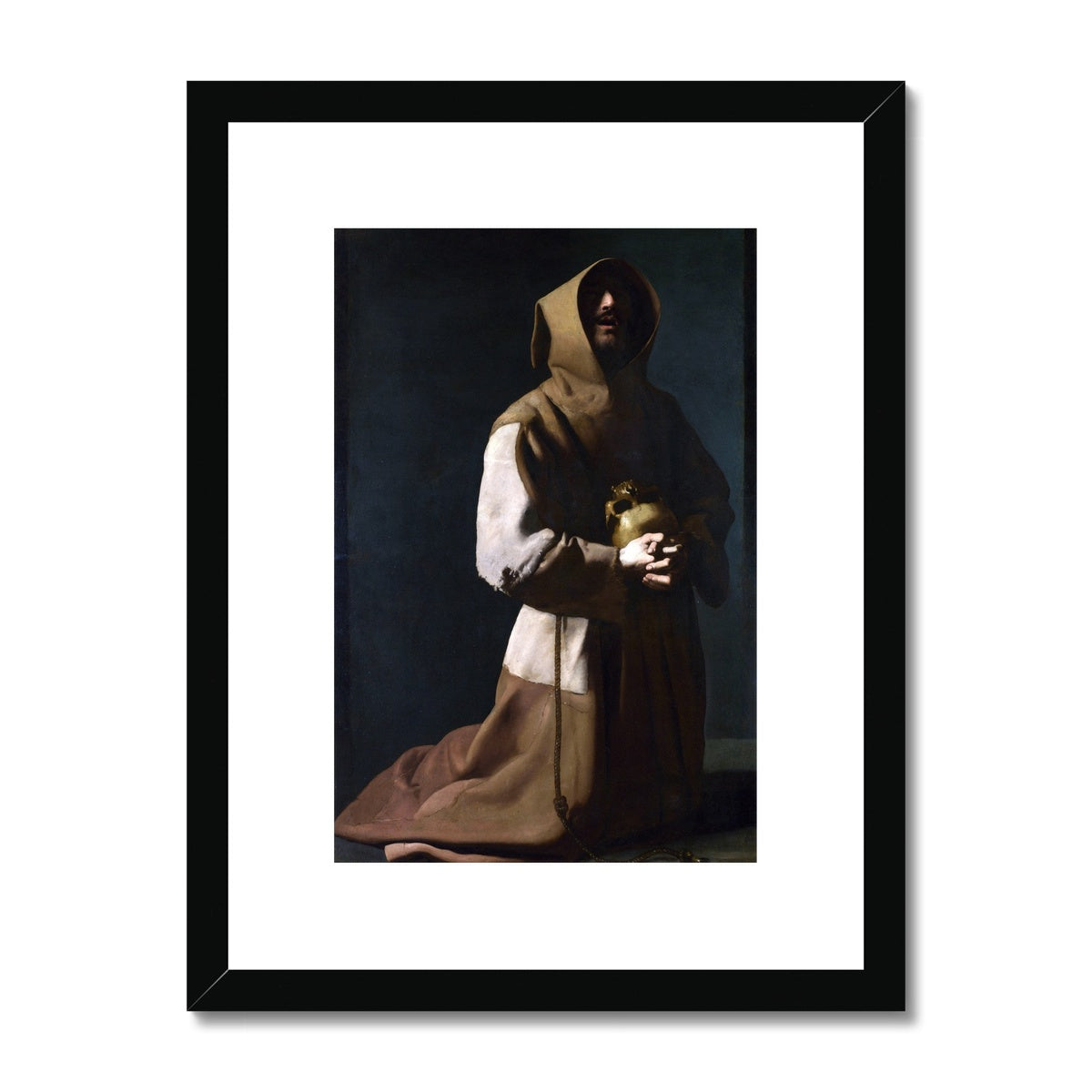 "Saint Francis in Meditation" is a painting by Spanish Baroque artist Francisco de Zurbarán, created in the early 17th century. The painting depicts Saint Francis of Assisi in a contemplative pose, with his hands folded in prayer and his eyes downcast. The saint is shown against a dark background, emphasizing his spiritual introspection and detachment from worldly distractions. The painting is notable for its simple, austere composition and its use of light, which creates a glowing aura around the saint, reinforcing his holiness and purity. The painting is considered a masterpiece of Spanish Baroque art and is admired for its serene beauty and spiritual intensity.