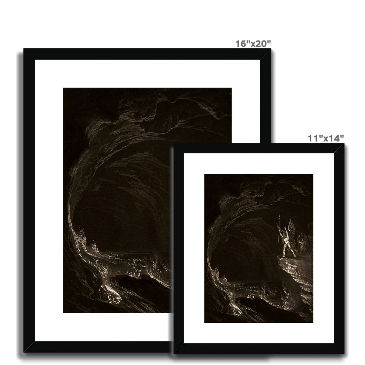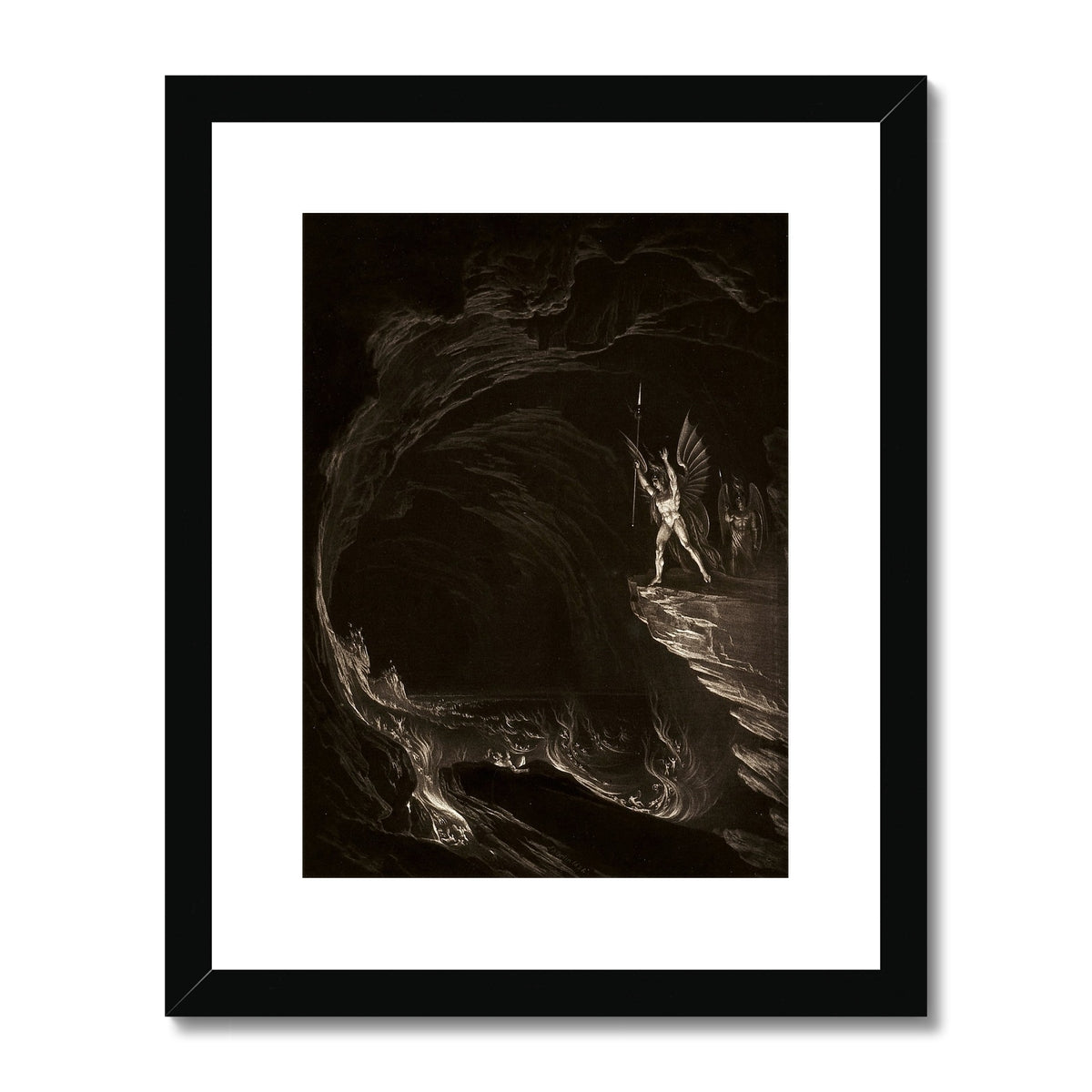 This image is a mezzotint engraving by John Martin titled Satan Arousing the Fallen Angels, inspired by Paradise Lost by John Milton. The scene depicted is from Book 1, line 314 of the epic poem, where Satan, cast out of Heaven, rallies the fallen angels. In the image, Satan stands on a rocky precipice, his wings spread, holding a spear as he gestures to the horde of fallen angels below. The dark and dramatic landscape surrounding Satan, with swirling flames and turbulent waves, highlights the chaos and grandeur of Hell. Martin’s use of light and shadow, typical of his work, creates a stark contrast that enhances the epic and infernal nature of the scene. The composition emphasizes Satan’s commanding presence, casting him as a tragic and powerful figure in the desolate abyss.