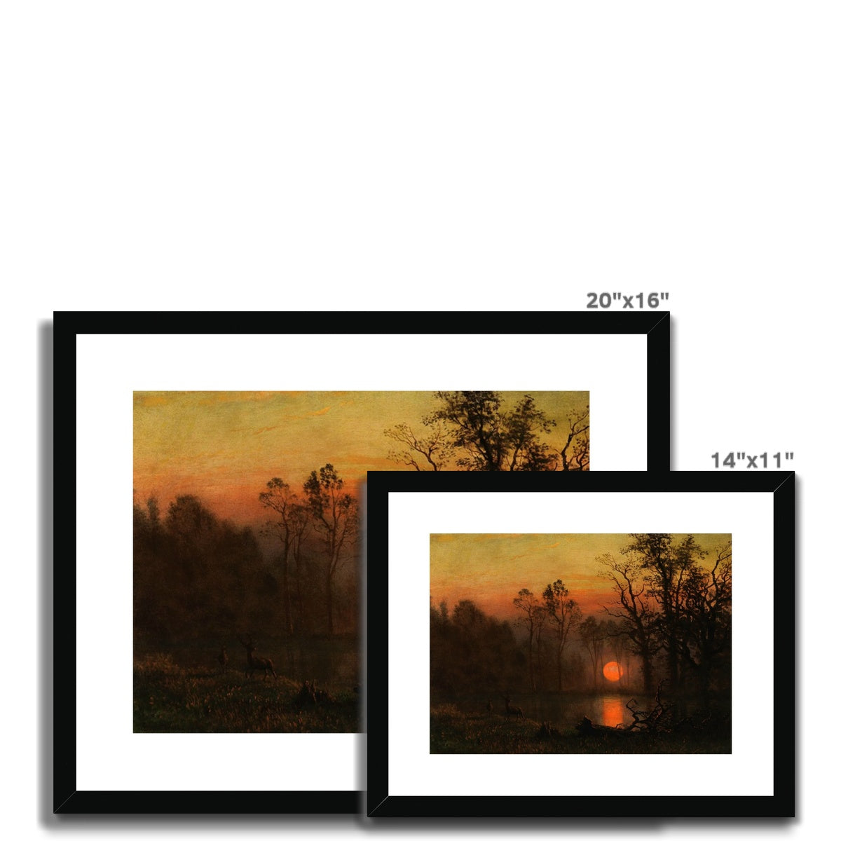 Sunset Over the Plains (also known as Deer in a Sunset Landscape, c. 1887) by Albert Bierstadt is a luminous, atmospheric painting that captures the tranquil beauty of nature at dusk. The scene depicts a pair of deer standing by a quiet water’s edge, silhouetted against a glowing red-orange sun sinking behind a dense forest. The tall, dark trees and rich shadows contrast vividly with the radiant sky, enhancing the drama of the setting sun. Bierstadt’s romantic treatment of light and landscape evokes a deep sense of serenity and reverence for the wilderness.