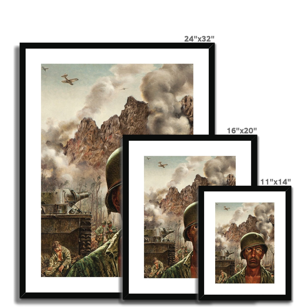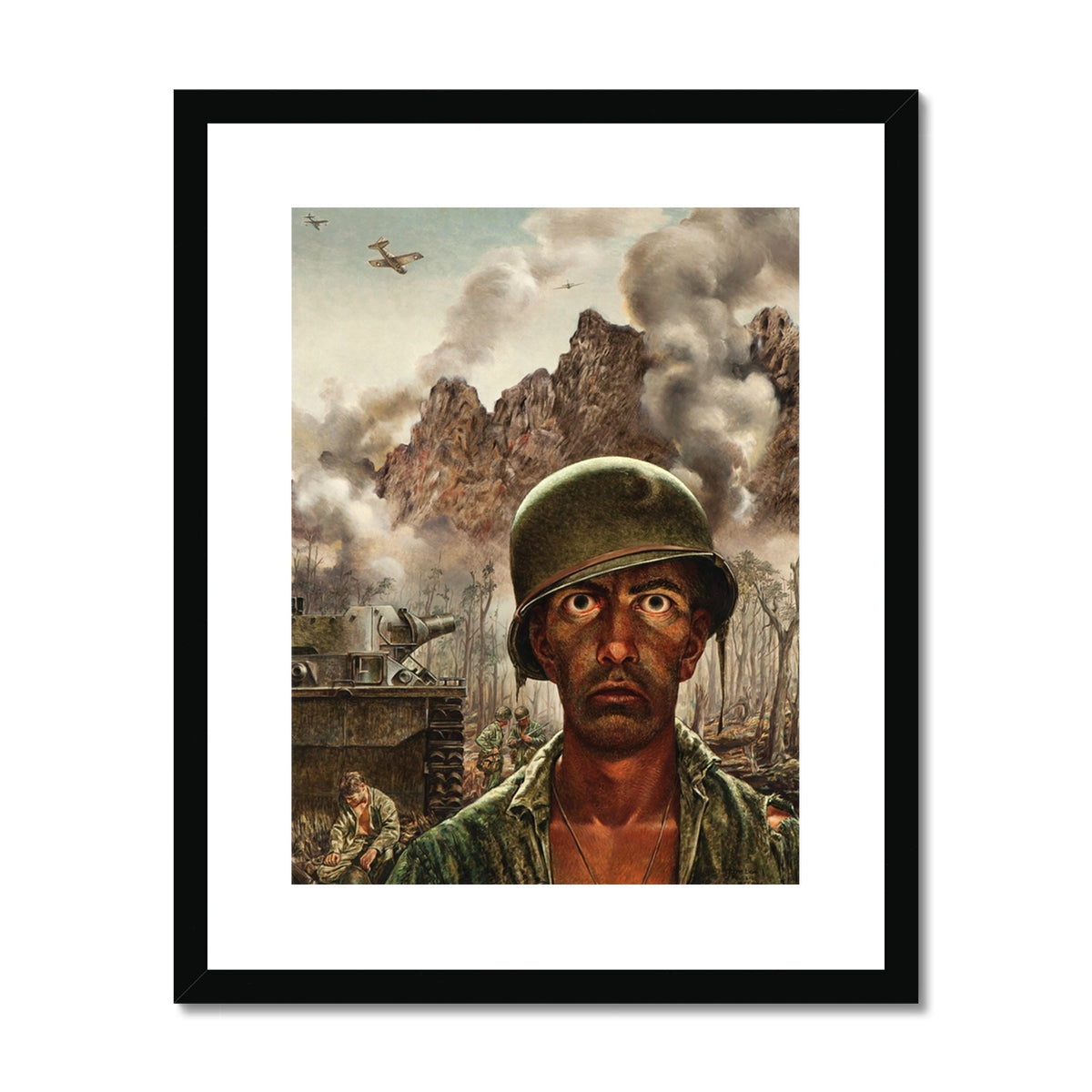 "That Two Thousand Yard Stare" by Thomas Lea (1944) is a powerful wartime painting depicting the haunting psychological toll of war. The central figure is a battle-worn soldier with wide, hollow eyes that seem to look beyond the viewer, symbolizing trauma and detachment. Set amidst a chaotic battlefield with smoldering mountains, tanks, and planes overhead, the scene conveys the devastating reality of combat. Surrounding him, other soldiers and equipment emphasize the collective strain of war, while his expression captures the individual experience of profound exhaustion and emotional numbness. The piece is a poignant representation of the cost of war on the human spirit.