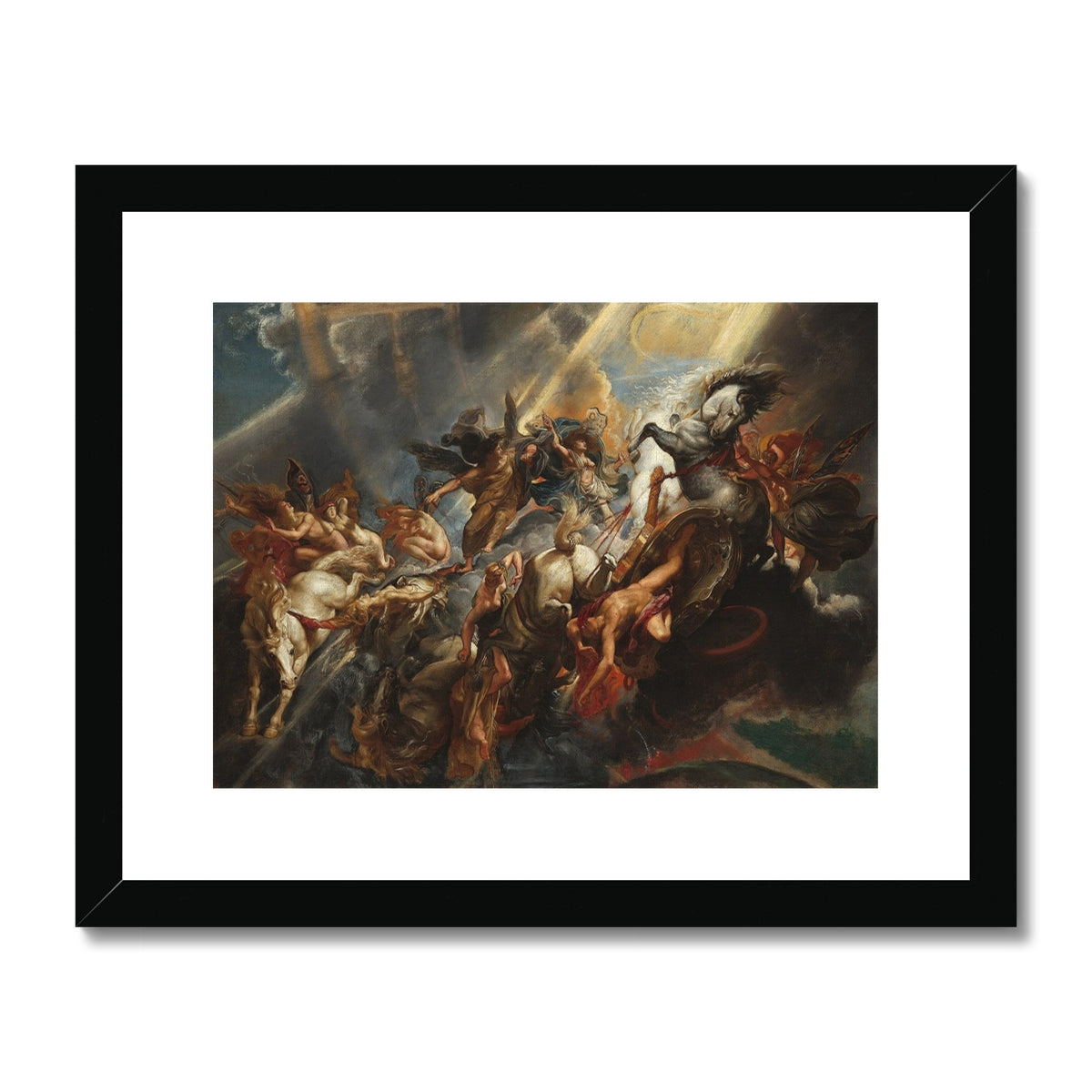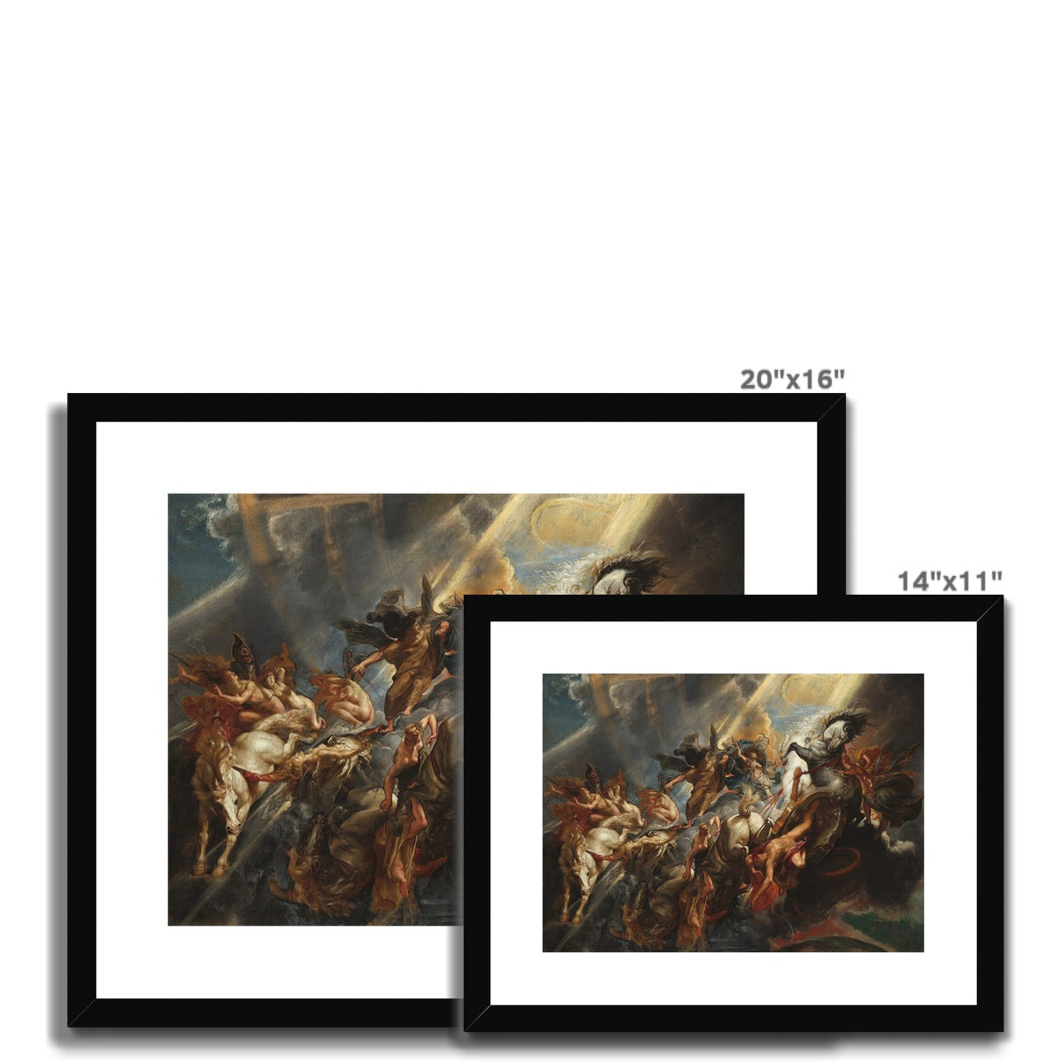 The Fall of Phaeton by Flemish master Peter Paul Rubens is a dynamic and dramatic depiction of the Greek myth of Phaeton, a popular subject in art history. In this scene, Rubens captures the chaotic moment when Zeus (Jupiter) hurls his thunderbolts, seen in the upper right, to punish Phaeton for losing control of the chariot of the Sun. The thunderbolts illuminate the scene, heightening the terror and anguish on the faces of Phaeton, the rampaging horses, and the figures caught in the celestial disaster. The butterfly-winged women in the painting represent the Hours and Seasons, who recoil in horror as the natural order of night and day is thrown into chaos. The painting also shows the disrupted astrological circle arching through the heavens.