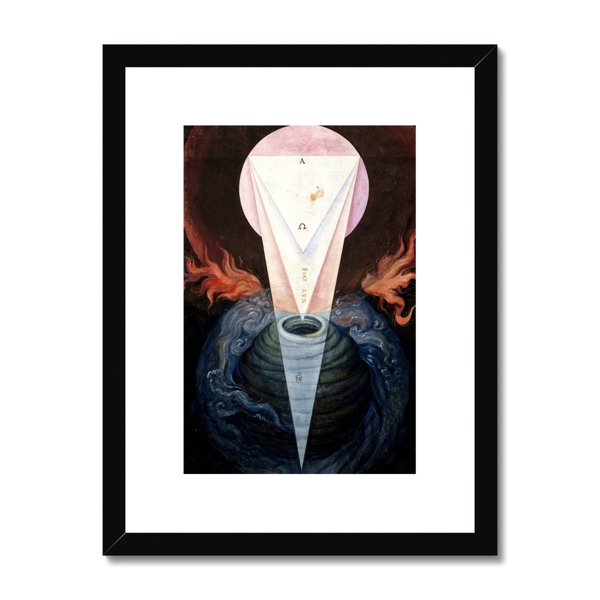 Francisco de Holanda's The First Day of Creation (1545) is a mystical and symbolic representation of divine creation. A luminous triangle, inscribed with the Greek letters Alpha and Omega and the Latin phrase “Fiat Lux” (“Let there be light”), descends from a radiant circle into a swirling, primordial void. Flames and cosmic waters surround the central vortex, suggesting chaos giving way to divine order. The painting blends Renaissance humanism with Christian cosmology and Neoplatonic thought, visualizing the moment light emerged from darkness.