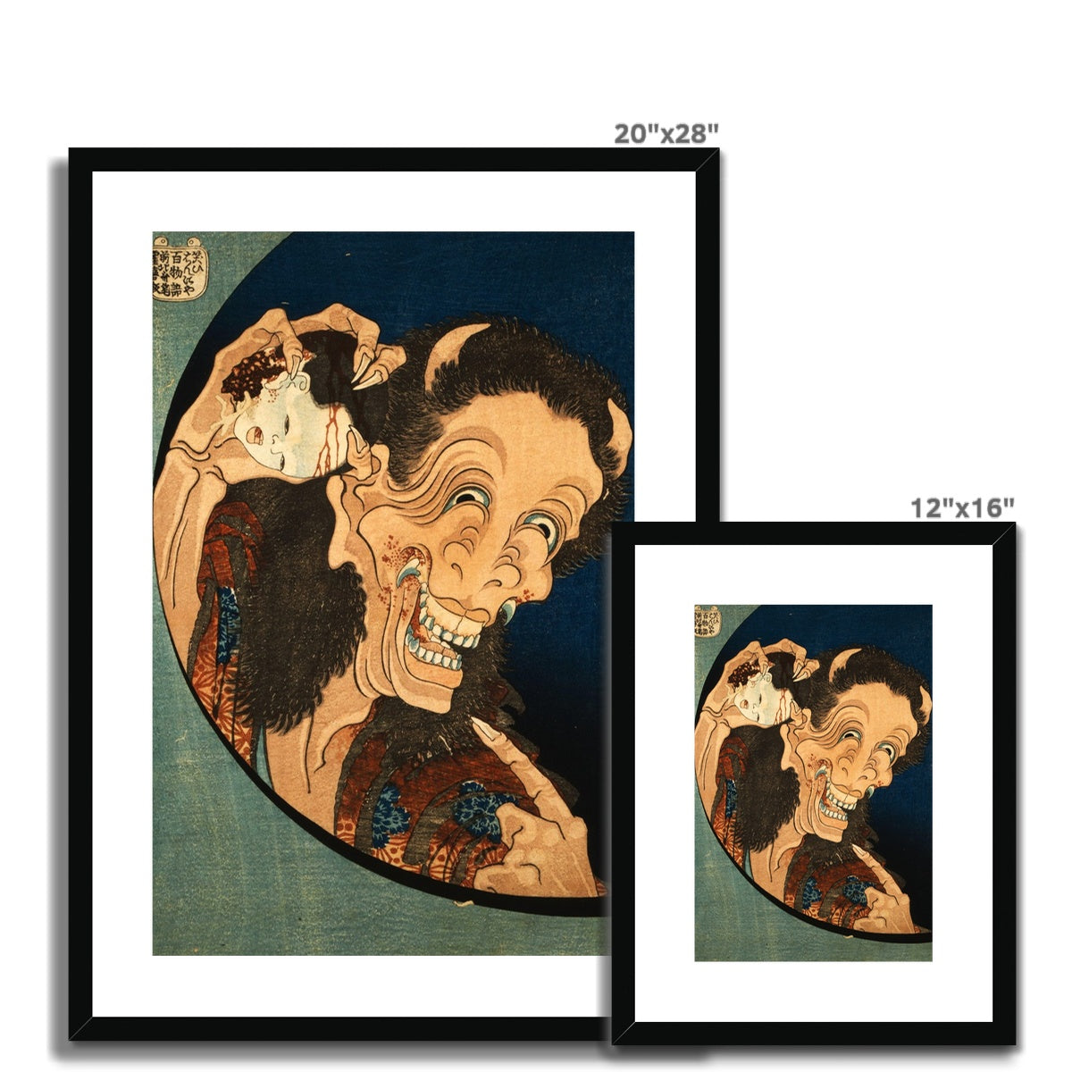 The Laughing Demon by Katsushika Hokusai, created around 1830, is a striking example of Japanese ukiyo-e art. This woodblock print features a grotesque, demonic figure with exaggerated facial features, wide, manic eyes, and a gaping, toothy grin. The distrubing imagine of the demon clutching a small, decapitated child like head, makes for an unsettling atmosphere. The use of bold lines, vivid colours, and distorted anatomy emphasizes the nightmarish quality of the image. Hokusai's work captures elements of Japanese folklore and the supernatural, blending traditional artistic techniques with macabre subject matter.