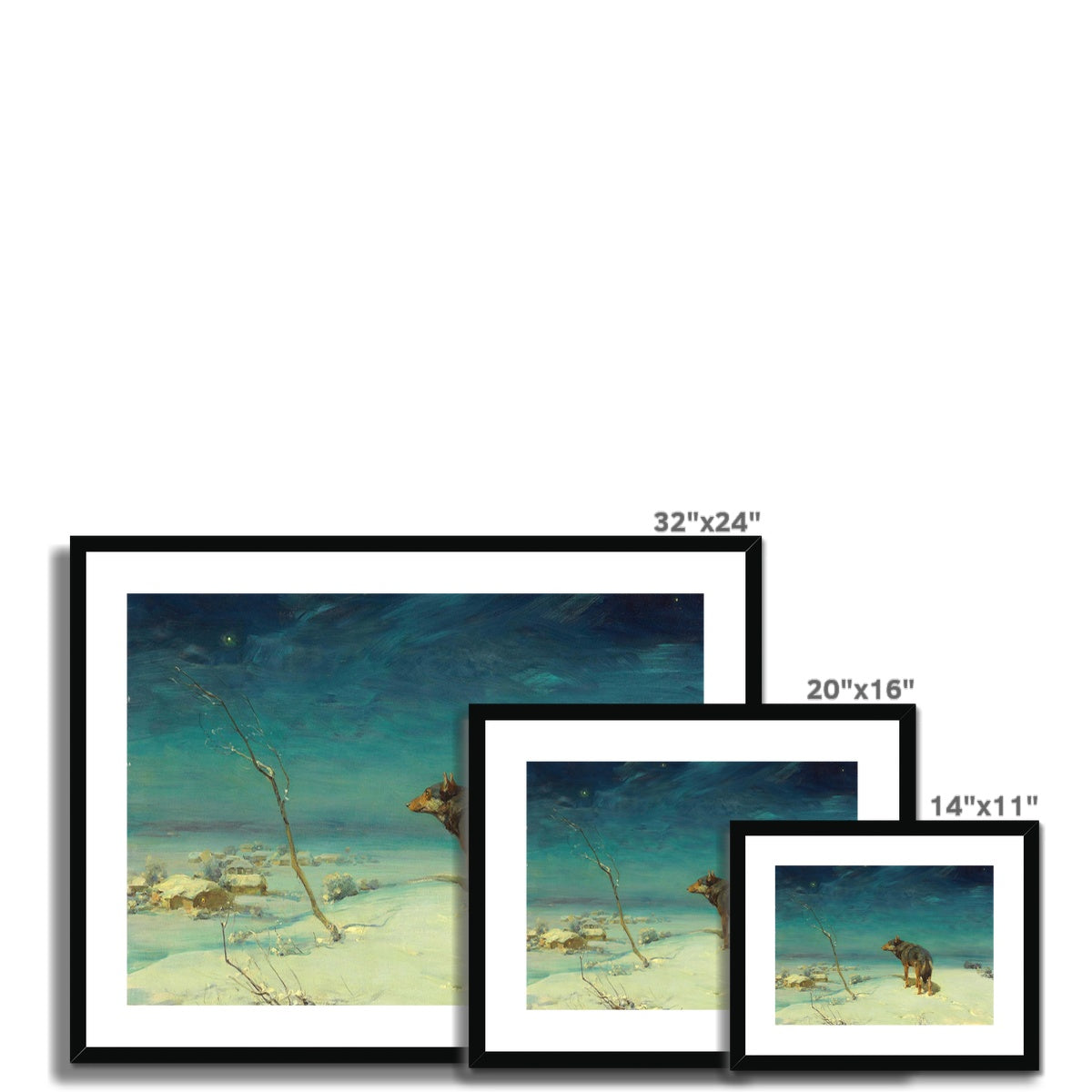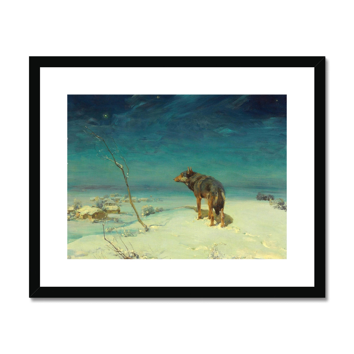 "The Lone Wolf" by Alfred von Wierusz-Kowalski (1849–1915) is a hauntingly atmospheric oil painting that captures a solitary wolf standing on a snowy hill under a twilight sky. The animal gazes toward a distant village, bathed in cold moonlight, conveying a sense of isolation and quiet tension. The stark contrast between the warmth of the village lights and the icy wilderness enhances the feeling of the wolf's estrangement. This evocative scene reflects themes of solitude, survival, and the raw beauty of nature.