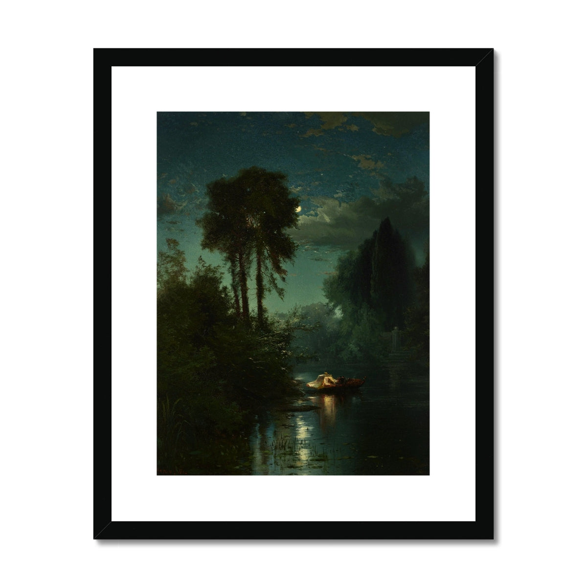 Thomas Moran’s The Water Party (1862) is a serene and atmospheric nocturnal scene depicting a small boat gliding across a moonlit river, surrounded by dense, shadowy foliage. Illuminated by the soft glow of the moon, the figures in the boat—elegantly dressed—appear engaged in quiet leisure, creating a sense of romantic tranquility. The reflection of the moonlight on the water and the delicate interplay of light and shadow highlight Moran’s early talent for capturing mood and nature’s quiet beauty. This evocative work blends realism with poetic ambiance, reflecting the influence of the Hudson River School and European Romanticism.
