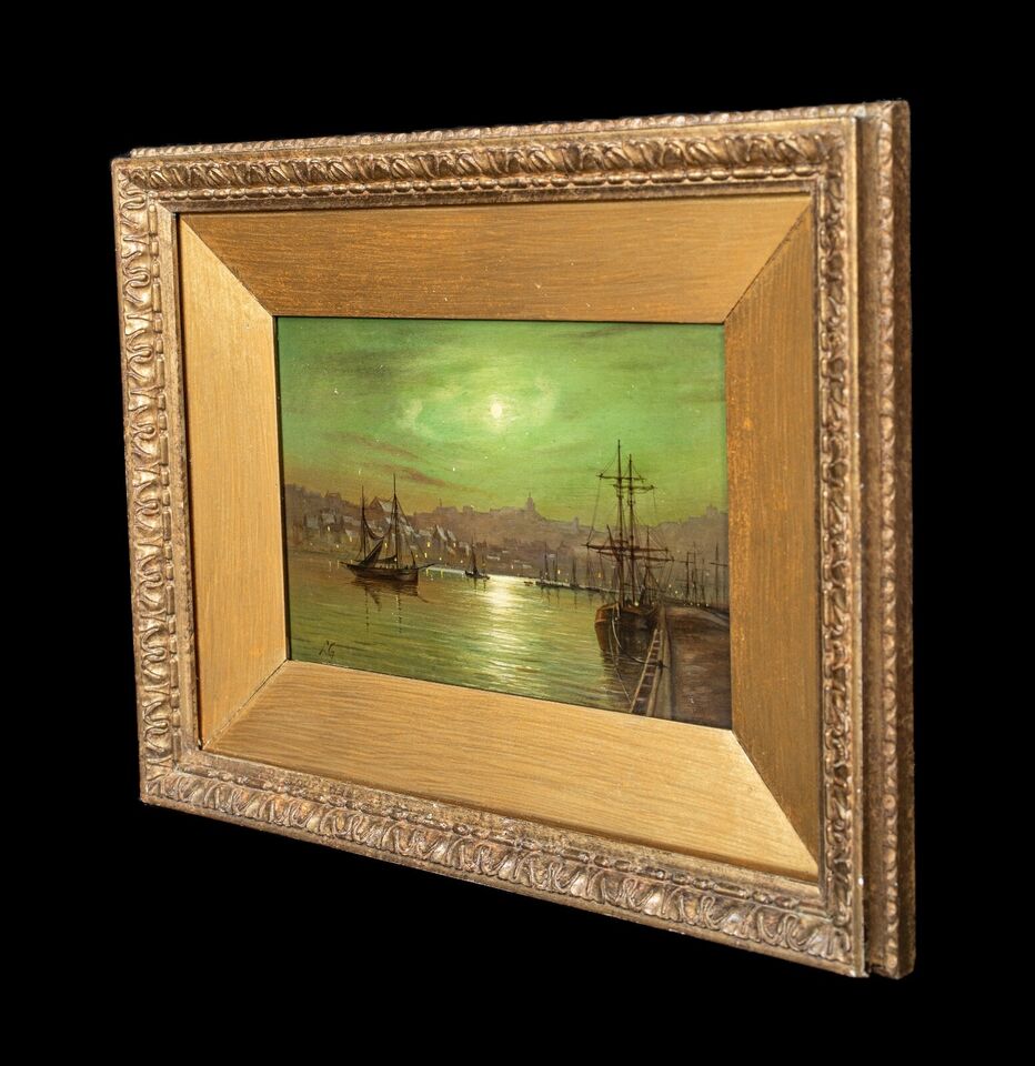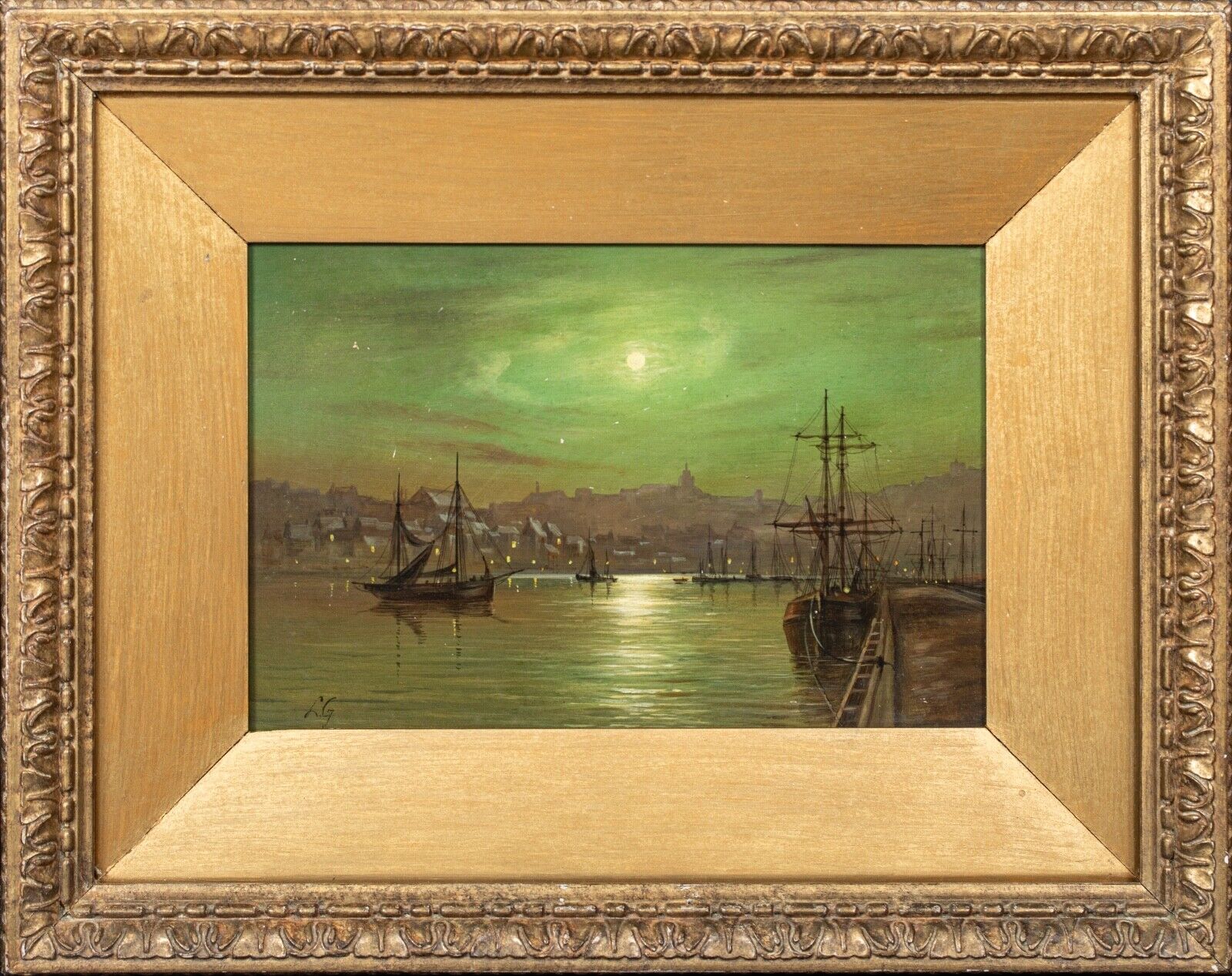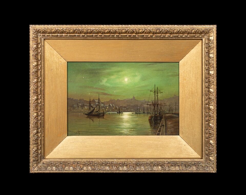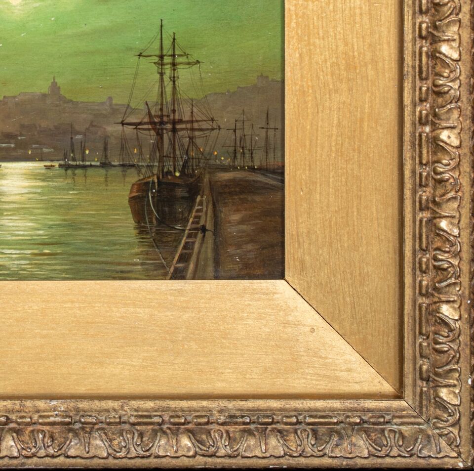 In the background, the silhouette of the town is discernible, with the lights of buildings adding a warm contrast to the cool greenish hue of the night sky. The composition captures the quiet beauty of the harbour at night, evoking a sense of tranquillity and timelessness. The painting is framed in an ornate, gilded frame, which complements the historic and elegant nature of the artwork.