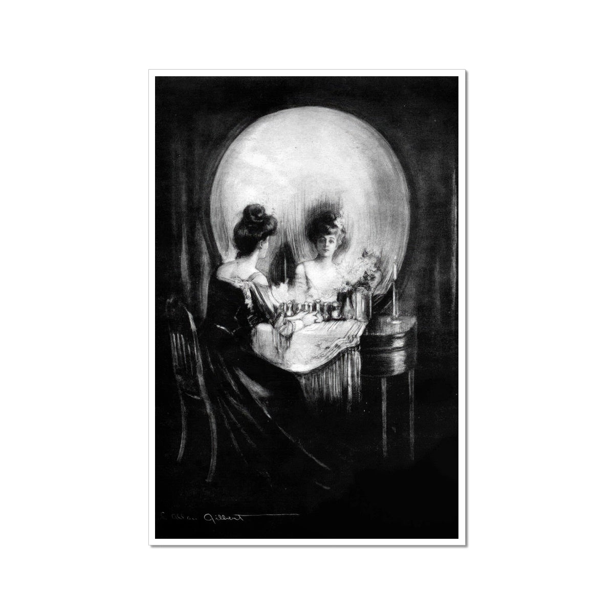 "All is Vanity" (1892) by Charles Allan Gilbert is a famous optical illusion illustration that cleverly juxtaposes beauty with mortality. At first glance, the image appears to be a human skull. However, upon closer inspection, it reveals a woman seated at her vanity table, gazing into a mirror. The woman's reflection, along with the objects on the table and the shape of the mirror, form the illusion of a skull. The artwork is a classic memento mori—reminding viewers of the transience of life and the futility of vanity.