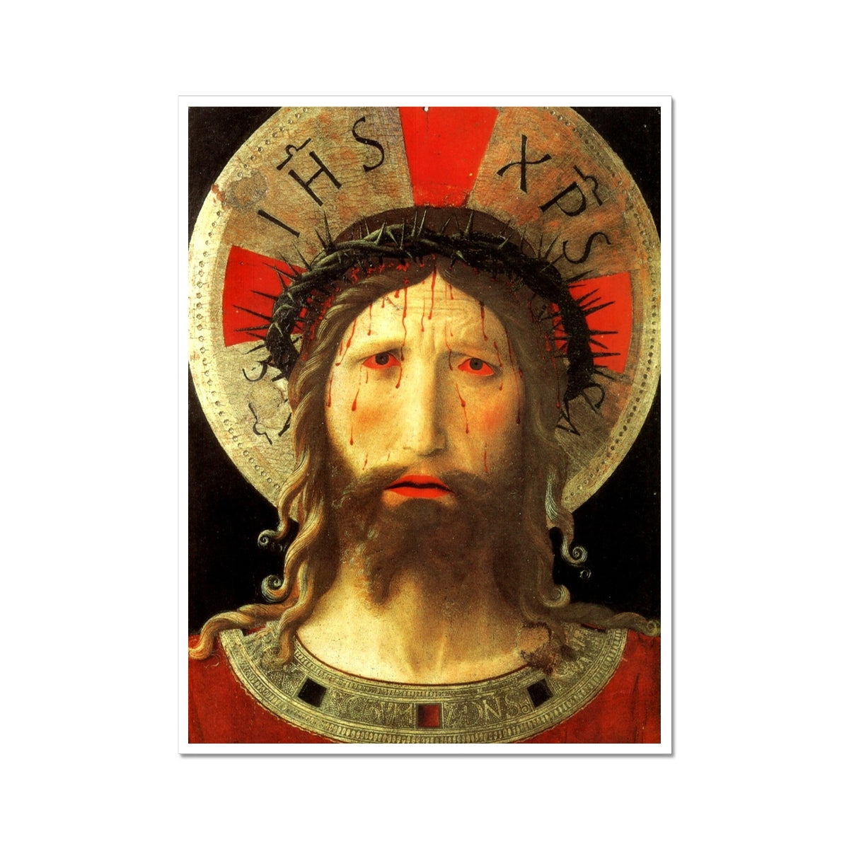 "Christ Crowned with Thorns" (c. 1450) by Fra Angelico is a striking and emotionally charged painting depicting the suffering of Christ. The composition centers on Christ's sorrowful face, with blood streaming from wounds inflicted by the sharp crown of thorns. His red-rimmed eyes and downturned lips convey a haunting sense of pain and resignation. The radiant halo behind his head, inscribed with the Greek letters for Jesus Christ, contrasts with the brutality of the thorns, underscoring the duality of divinity and human suffering. Fra Angelico’s intense realism and spiritual depth invite deep contemplation on the Passion of Christ.