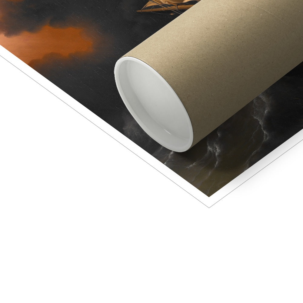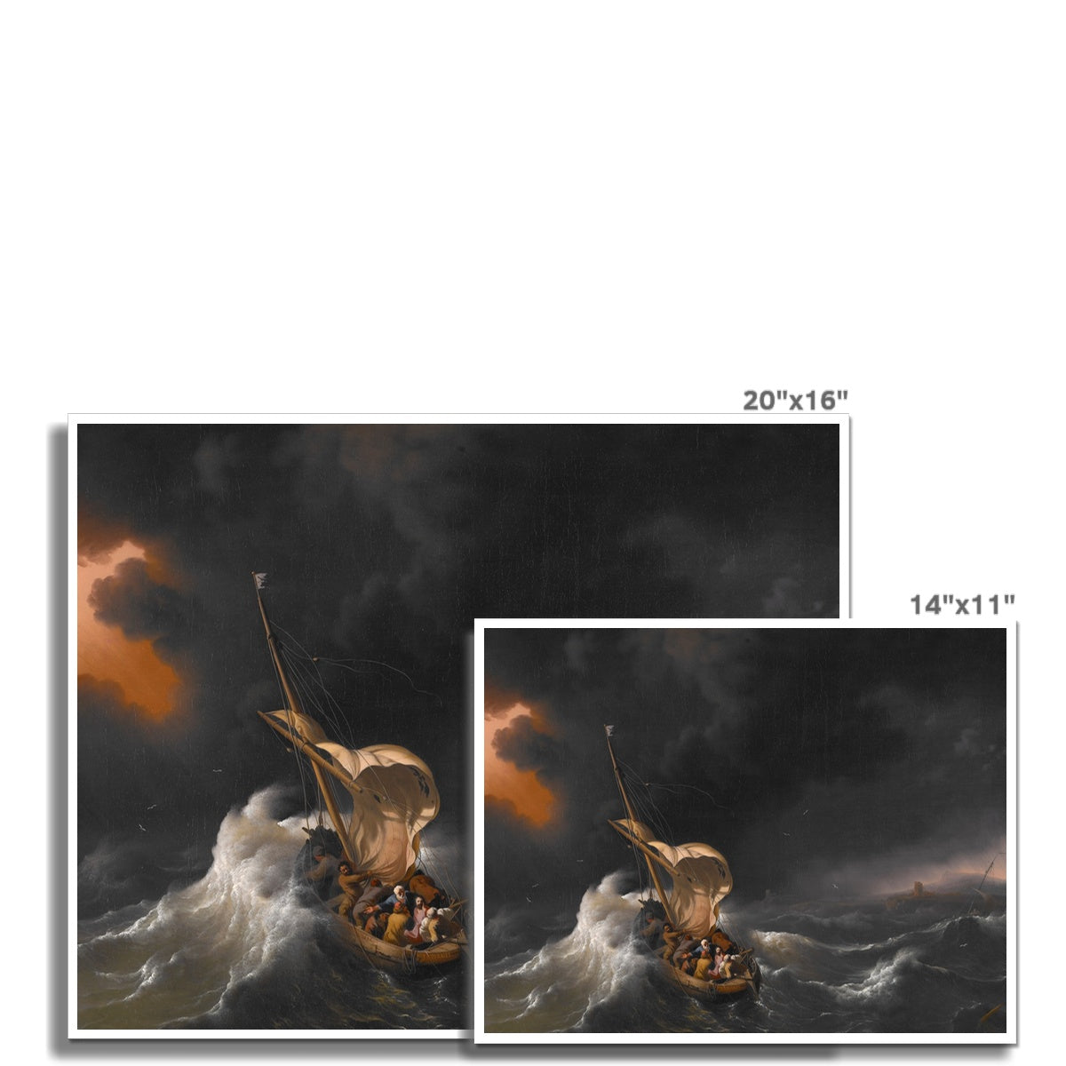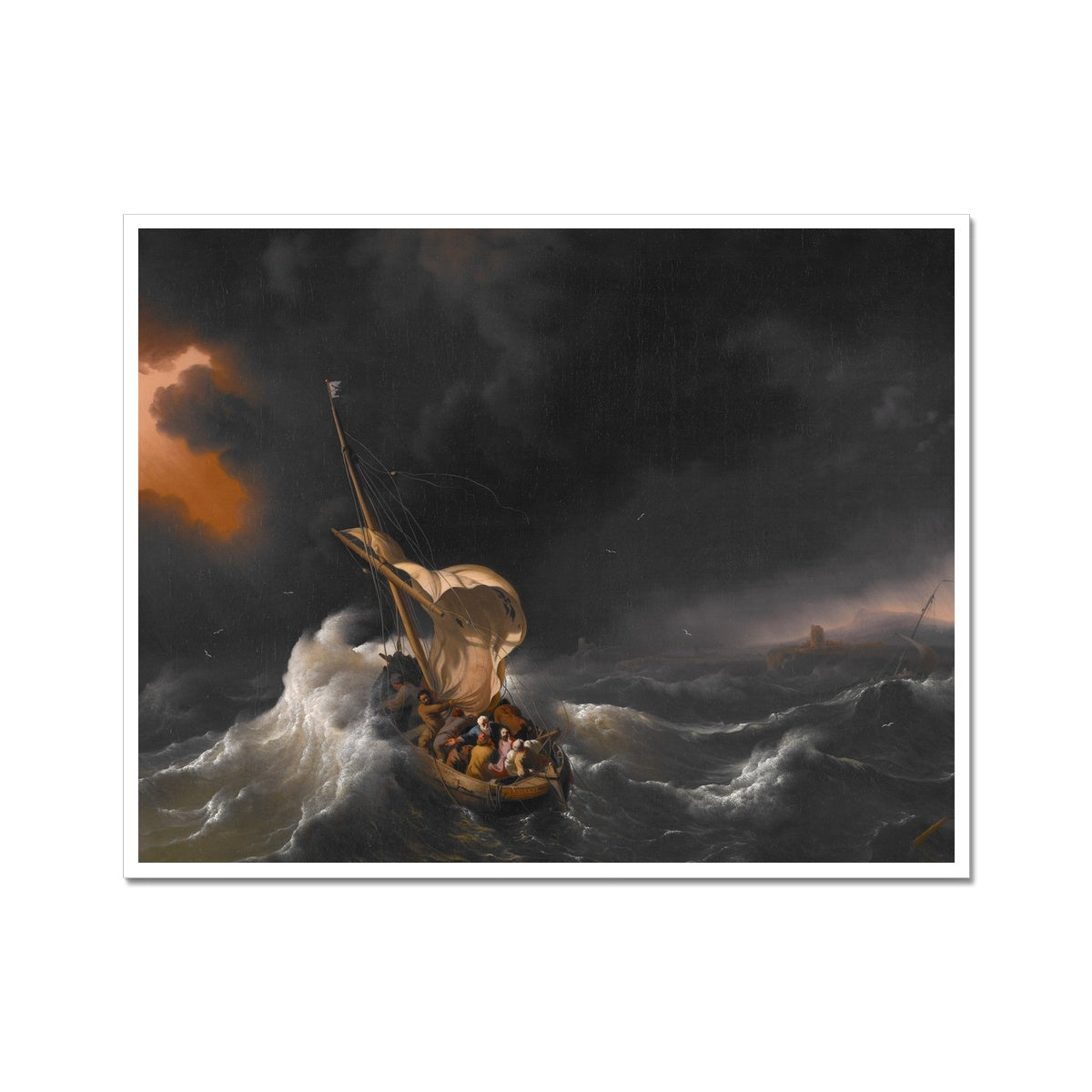 "Christ in the Storm on the Sea of Galilee" is a painting by Dutch artist Ludolf Backhuysen. It depicts the New Testament story of Jesus calming a storm on the Sea of Galilee. The painting shows a turbulent, tempestuous sea, with waves crashing against a small boat as the disciples desperately cling to the sides. In the center of the composition, Jesus stands confidently, his arms outstretched as if he is controlling the wind and waves. The figure of Christ is depicted with a strong, heroic quality, emphasizing his power over nature. The dramatic, emotive scene is rendered in Backhuysen's characteristic luminous, detailed style, with the bright light of the sunrise casting a warm glow over the figures and landscape. "Christ in the Storm on the Sea of Galilee" is considered a masterpiece of Dutch Baroque painting and a testament to Backhuysen's skill as a seascape artist.