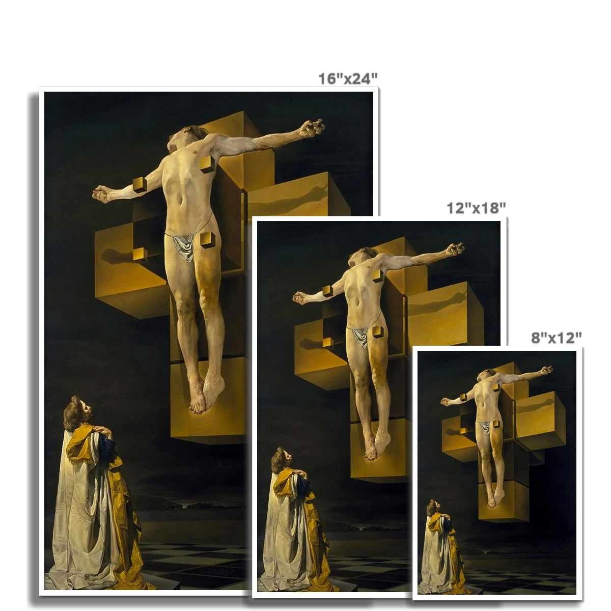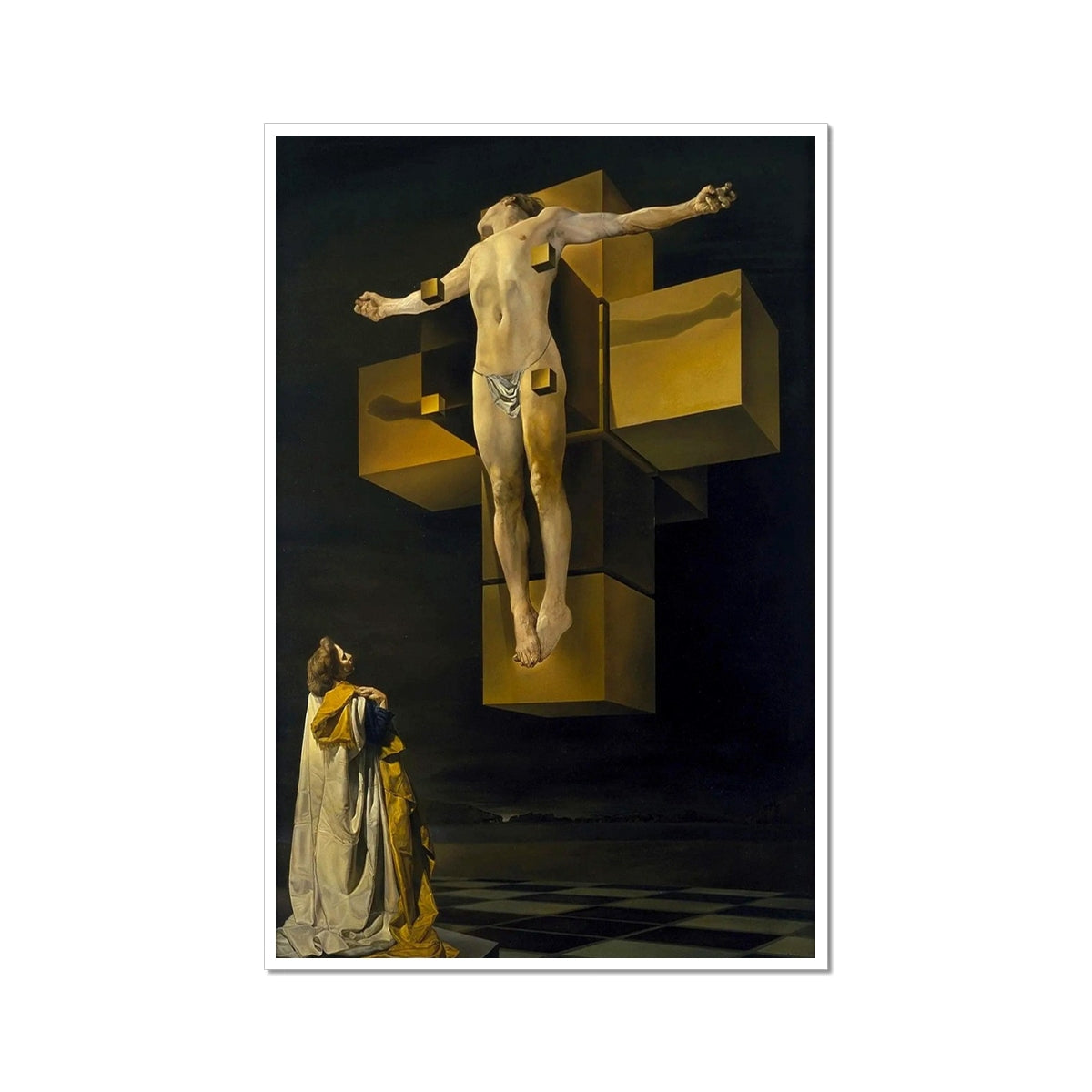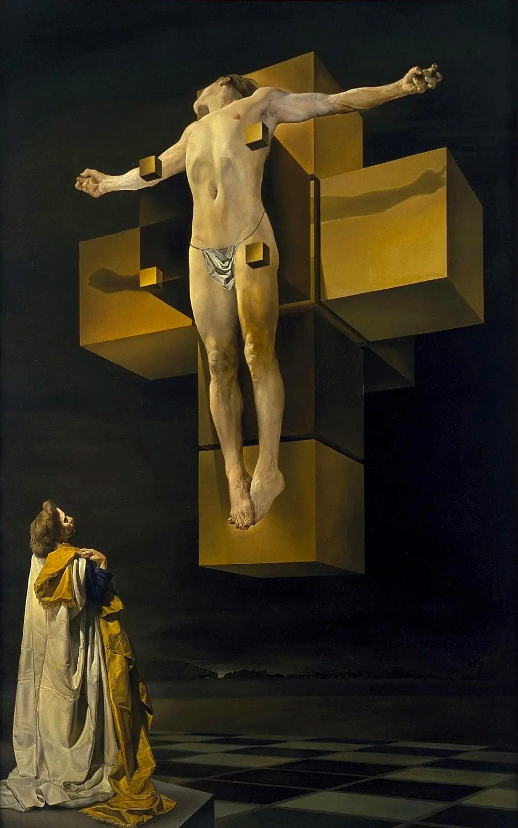 "Crucifixion (Corpus Hypercubus)" (1954) is a striking painting by Salvador Dalí that blends religious imagery with mathematical concepts. In this surreal depiction of Christ’s crucifixion, Dalí replaces the traditional wooden cross with a hypercube (a four-dimensional geometric figure unfolded into 3D space), symbolizing the fusion of science, mysticism, and spirituality. Christ is depicted with idealized, unblemished anatomy, floating above the ground. Below, a figure modeled after Dalí's wife, Gala, gazes upward in reverence. The painting exemplifies Dalí’s interest in nuclear mysticism and his effort to reconcile classical tradition with modern scientific thought.