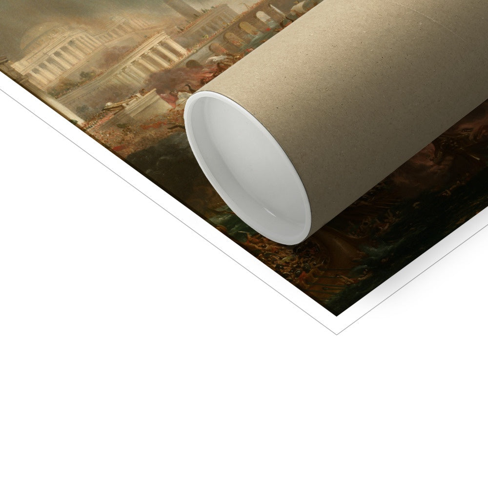 In the foreground a statue of some venerable hero (posed like the Borghese Gladiator) stands headless, still striding forward into the uncertain future. In the waning light of late afternoon, the dead lie where they fell, in fountains and atop the monuments built to celebrate the affluence of the now fallen civilization. The scene is perhaps suggested by the Vandal sack of Rome in 455. On the other hand, a detail in the lower right of "The Consummation of Empire" shows two children, maybe brothers, fighting, one clad in red and the other in green—the colors of banners of the two contending forces in "Destruction," which thus might depict a foreshadowed civil war. The children, now men, are shown, with one having finally prevailed over the other but seemingly in contemplation of the heavy price paid. In the painting, the red and green banners are on different sides of the river, with the green banners mostly on the temple side and the red banners predominantly on the palace side, maybe showing the still ongoing war between traditionalism and modernism