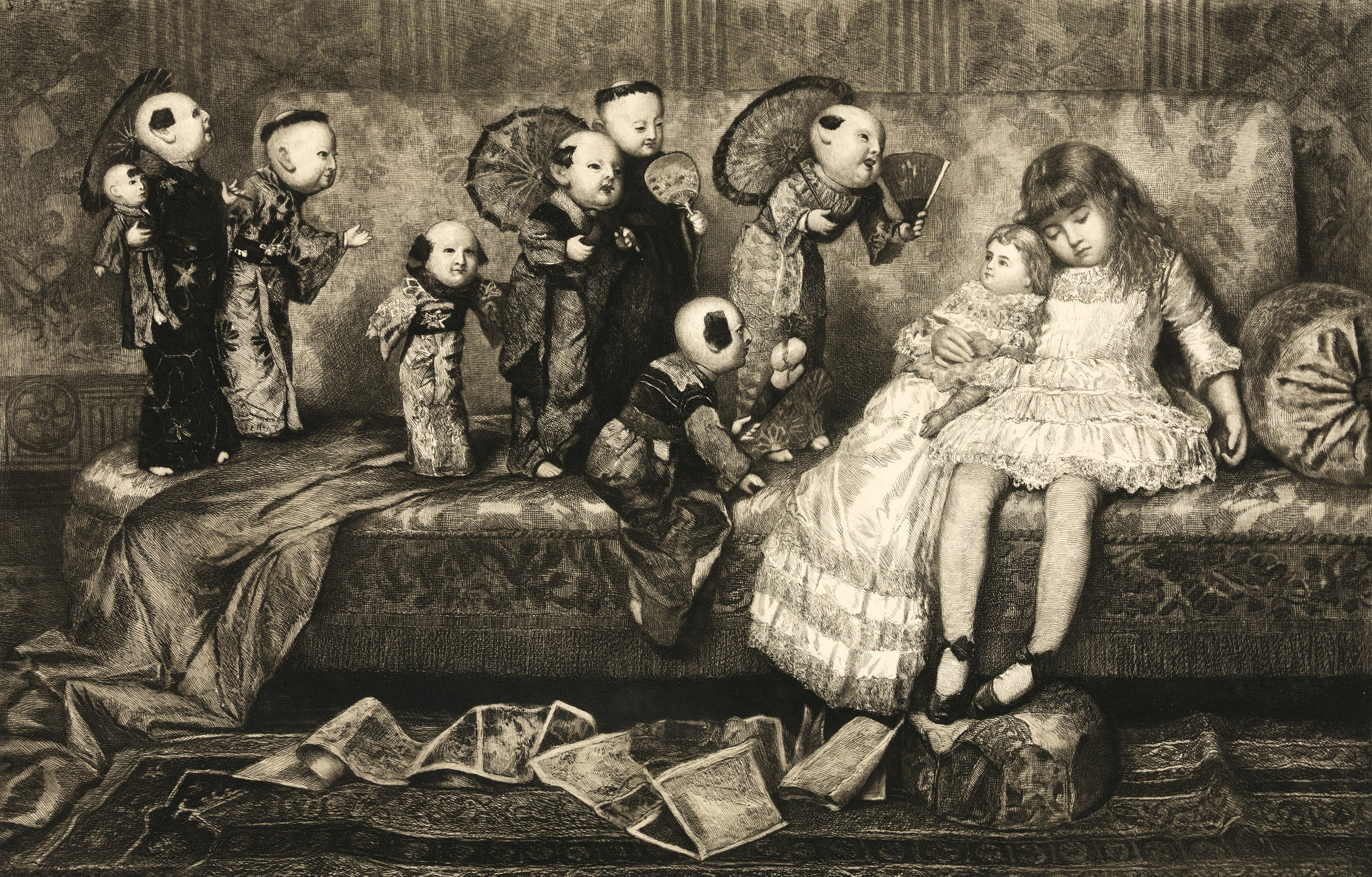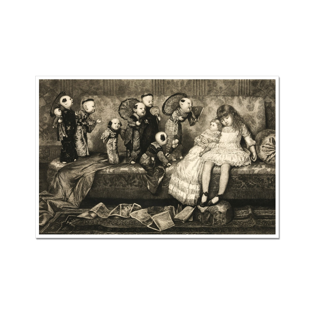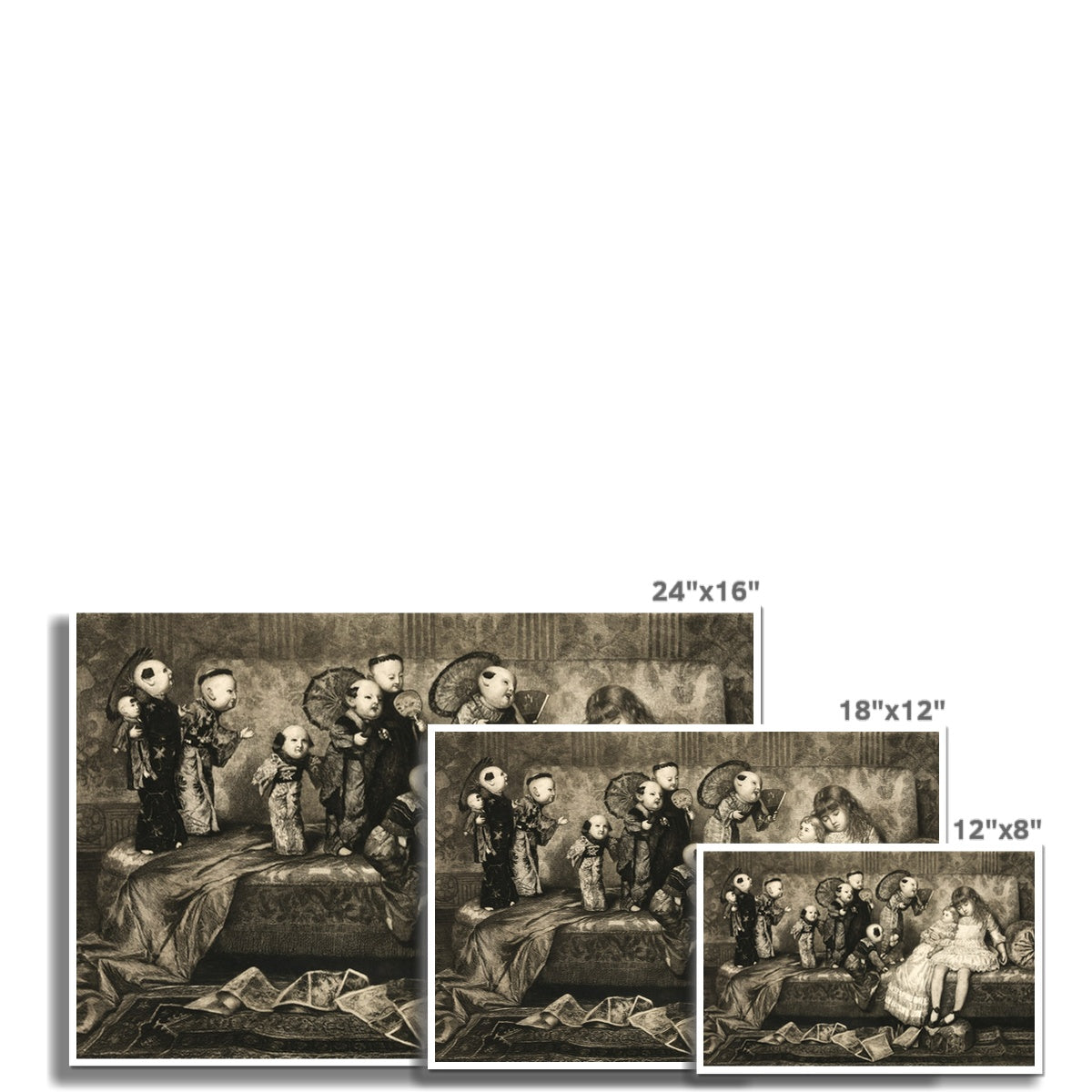 Dream Land by C. D. Weldon, created in 1883, is an enchanting and surreal scene that blends childhood innocence with dreamlike fantasy. The artwork features a young girl dressed in elegant attire, asleep on a richly adorned couch, clutching a doll in her arms. Around her, animated dolls dressed in elaborate costumes appear to come to life, engaging in playful and theatrical interactions. The intricate details of the textiles, the lifelike expressions on the dolls, and the soft, muted tones evoke a whimsical yet slightly eerie atmosphere. This painting captures the blurred line between imagination and reality, embodying the wonder of a child’s dreams.