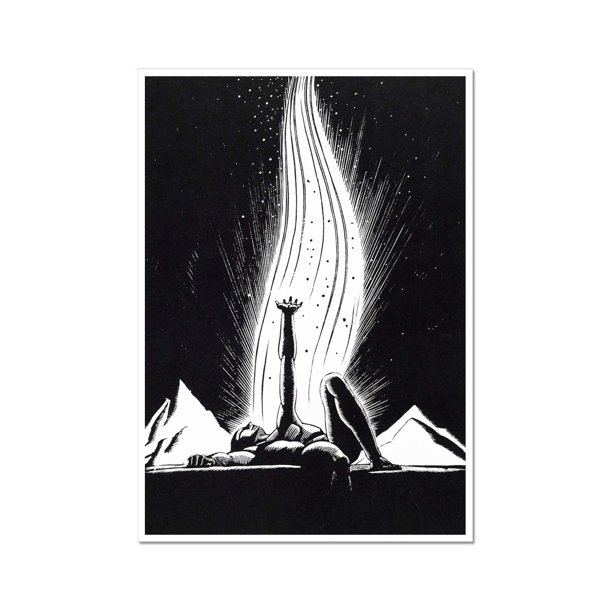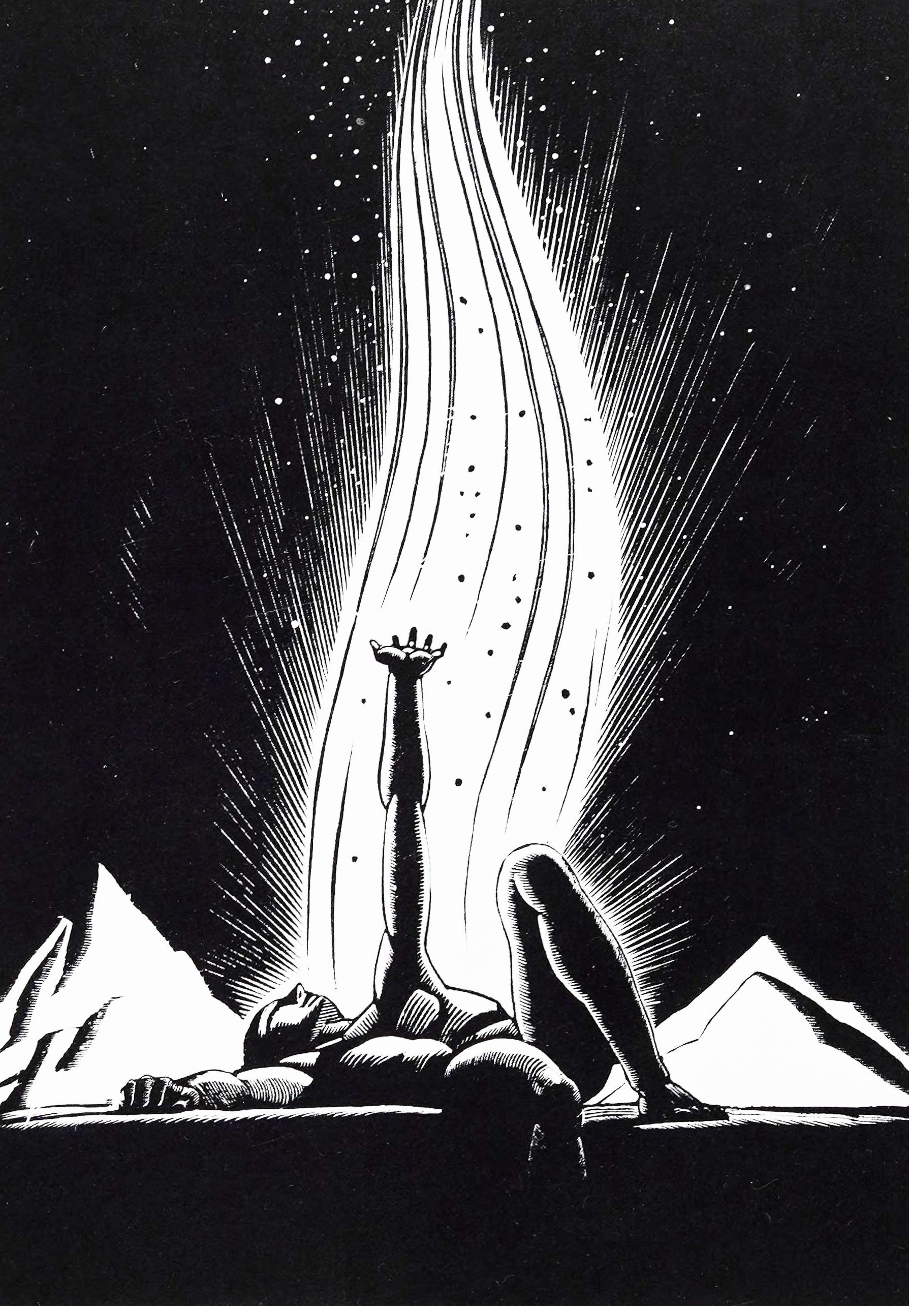 The artwork "Flame" by Rockwell Kent, created around 1928, is a striking black and white illustration that captures a highly stylized and symbolic scene. The image features a lone figure, reaching upwards with a hand crowned by a distinct, flame-like aura. This gesture is set against a backdrop of dark, star-filled sky and a stream of light or energy that flows upwards, evoking a sense of mystic or divine communication. The landscape below the figure includes stark, simplistic mountain forms, emphasizing the isolation and significance of the central figure's action. Kent's use of bold contrasts and minimalistic detail enhances the dramatic and almost spiritual quality of the piece.