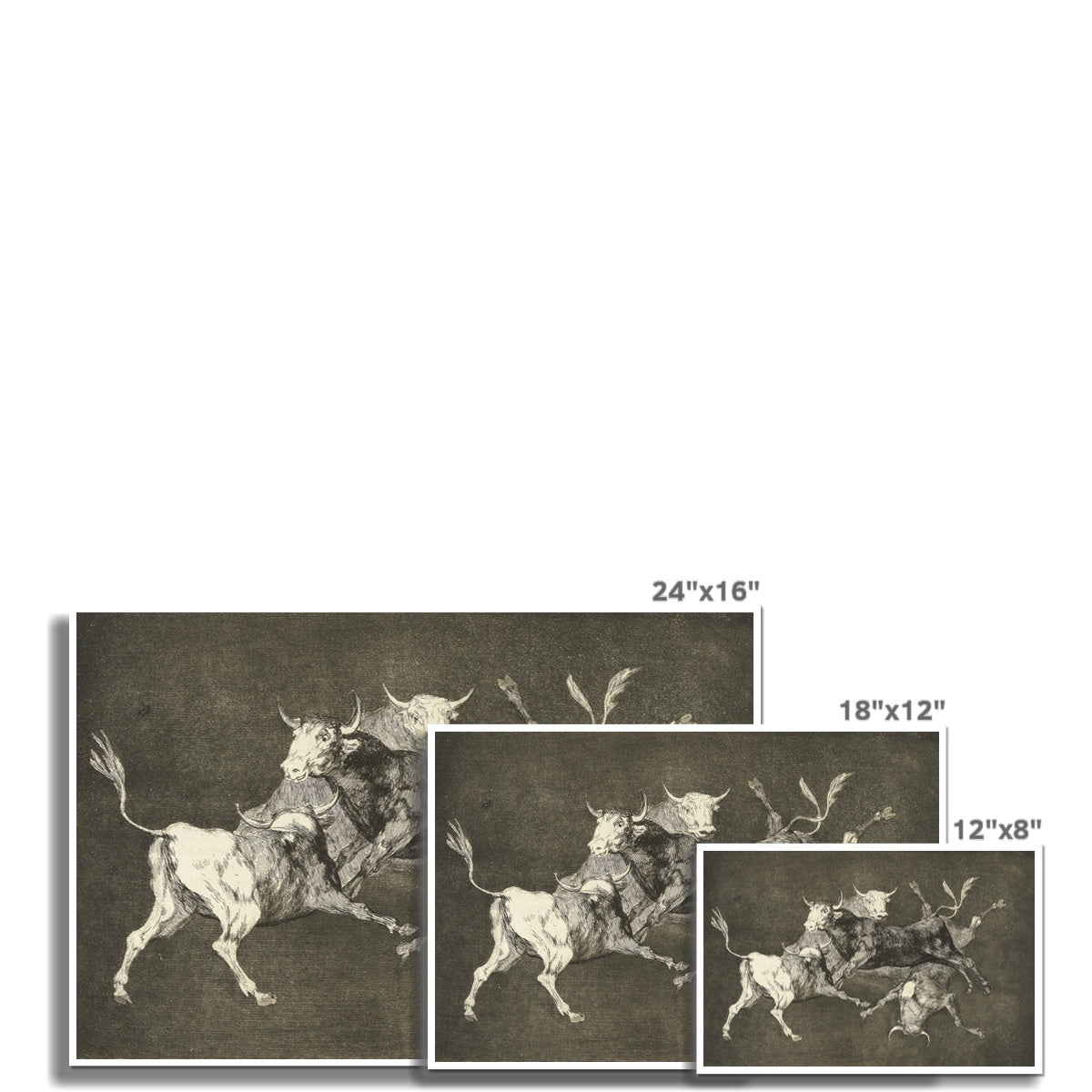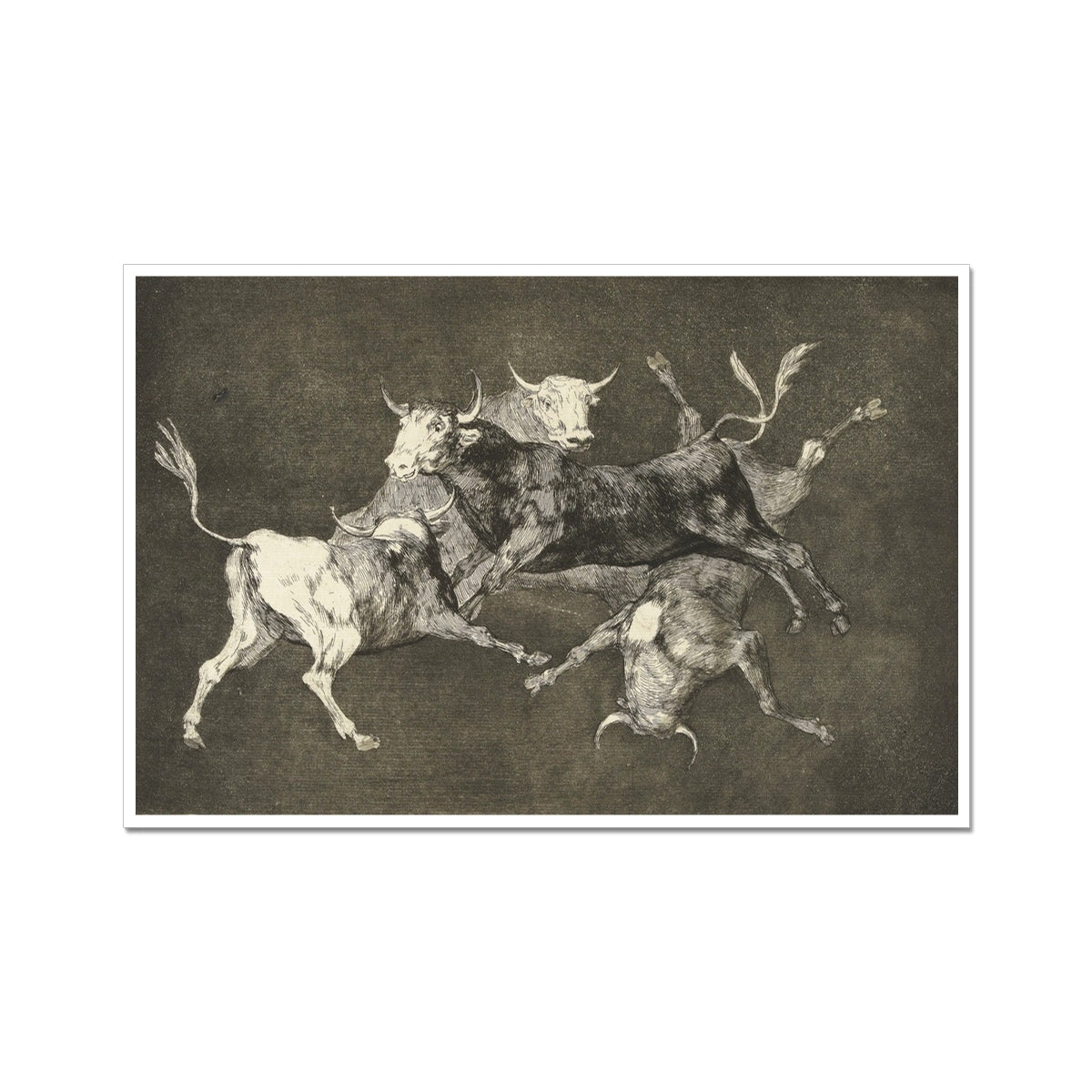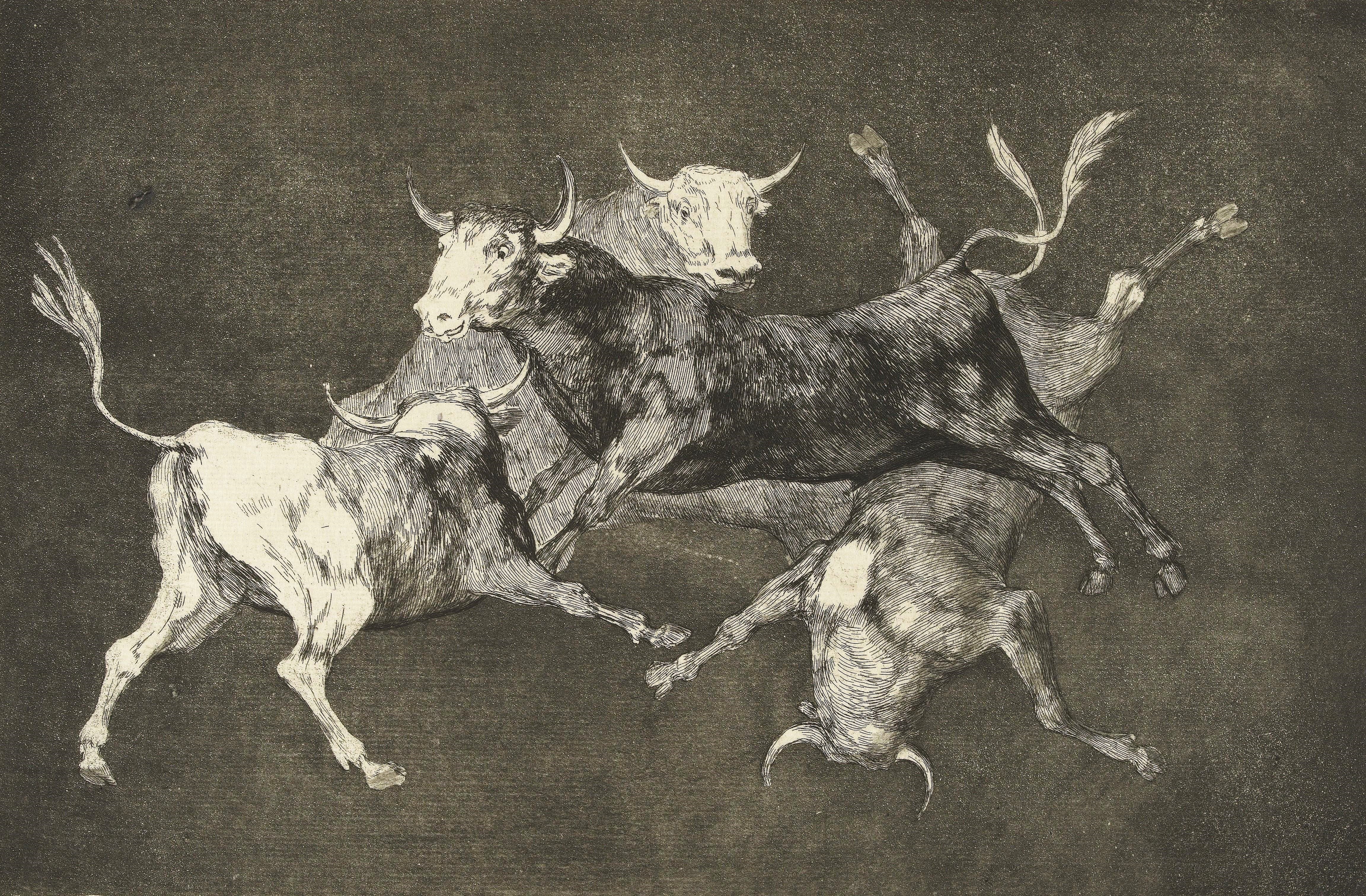 This illustration, titled "Foolishness of the Little Bulls", is part of Francisco de Goya's famous series, La Tauromaquia (circa 1820). The artwork depicts a dynamic and somewhat chaotic scene of young bulls engaging in a wild skirmish. Goya uses intense contrast and intricate linework to emphasize the movement and the energy of the animals. The theme satirizes human folly, as the young bulls’ frantic behaviour mirrors impulsive and irrational actions often seen in human nature. The dark tones create a dramatic atmosphere, characteristic of Goya's later works.