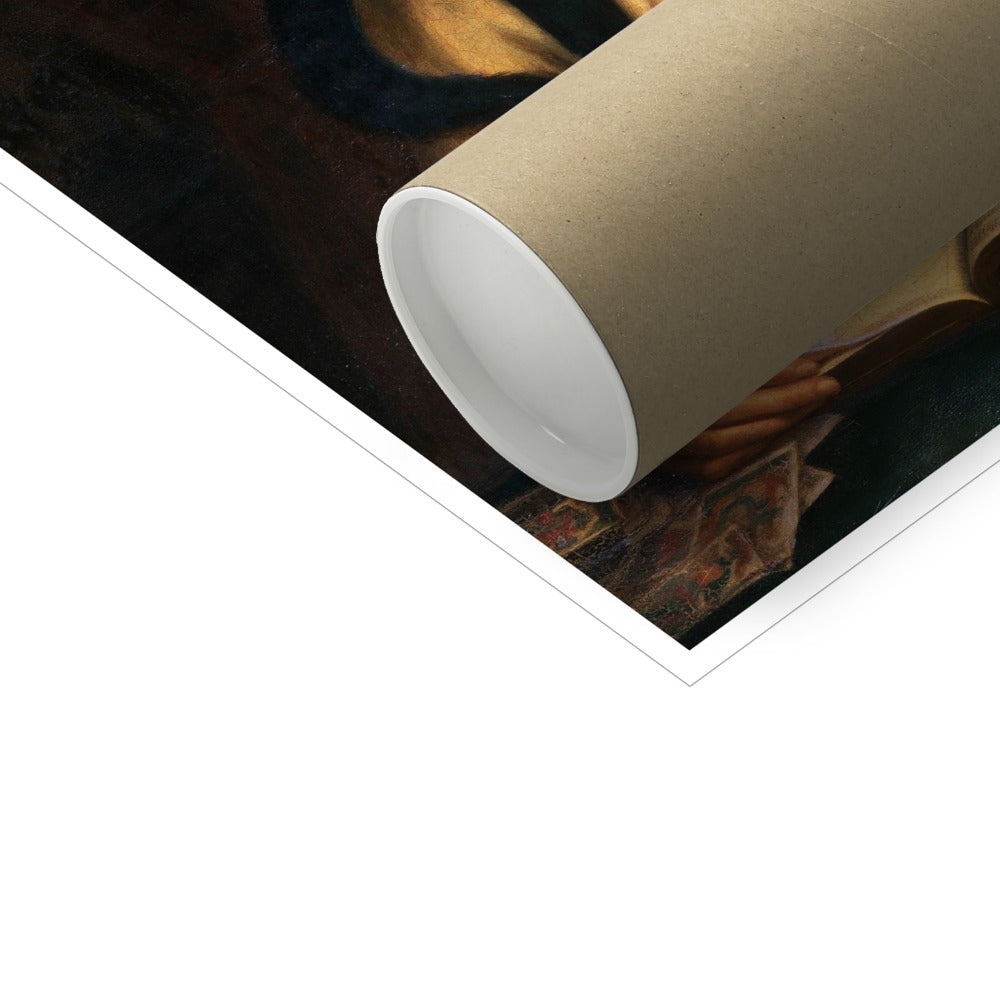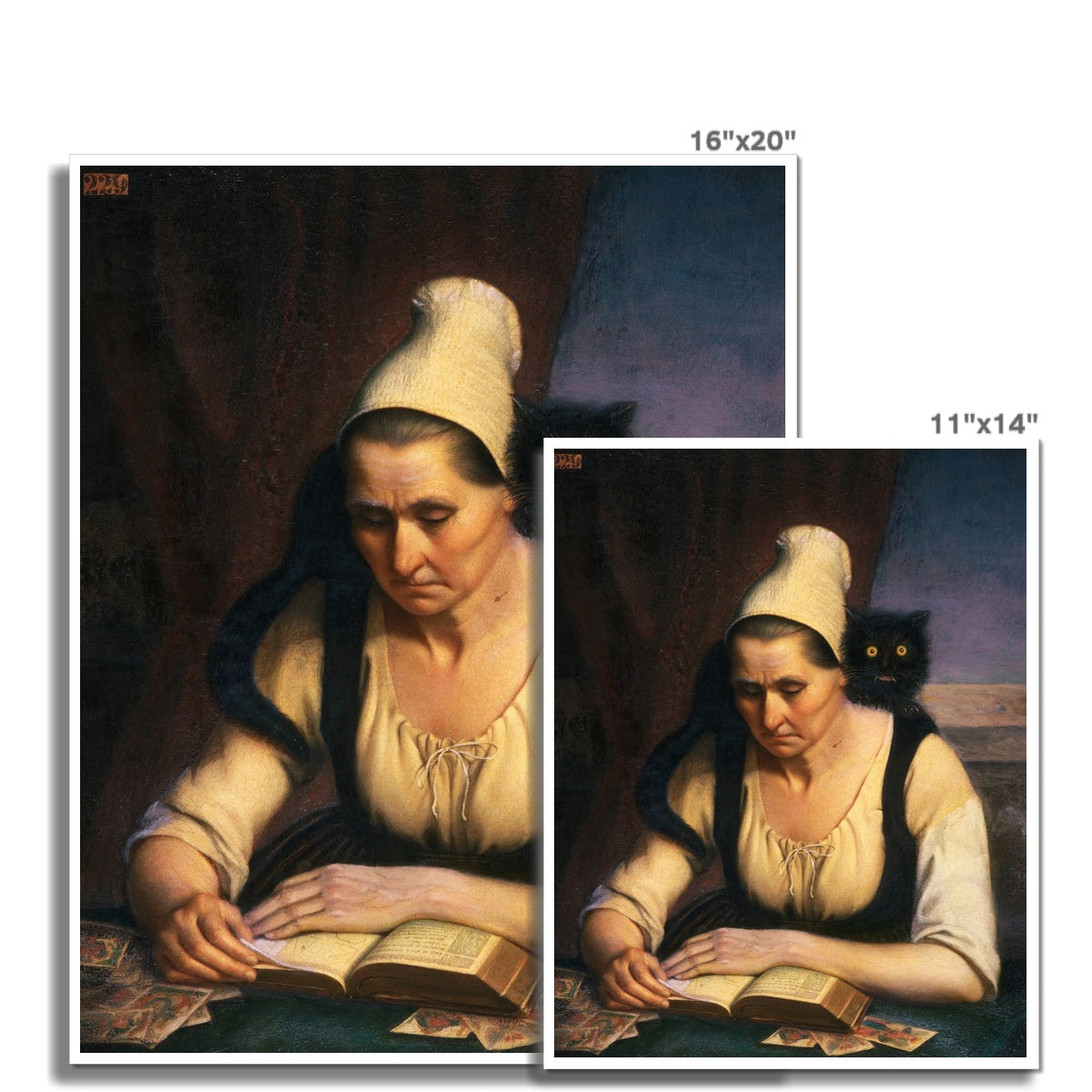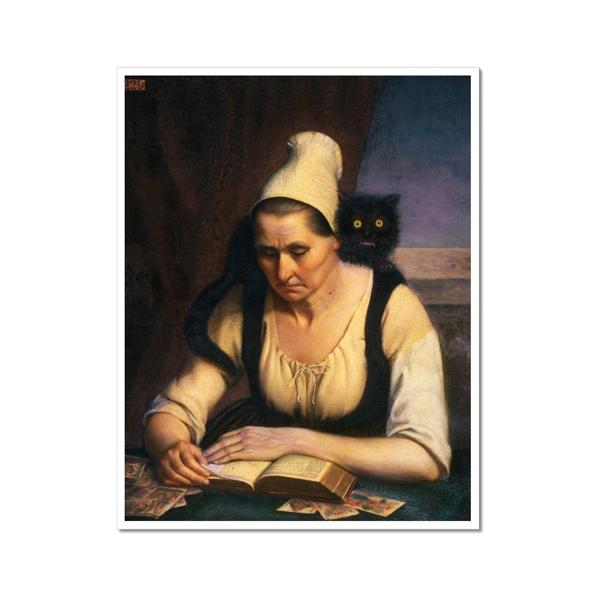 This captivating 1847 painting by Clémentine Dondey, Fortune Teller Studying a Book of Necromancy, masterfully blends realism with an eerie sense of mysticism. A solemn woman, clad in modest historical attire, is absorbed in an arcane tome, her weathered hands resting on the pages as she interprets its esoteric knowledge. Scattered tarot cards hint at her occult practices, but it i the presence of the uncanny black cat on her shoulder—its wide, glowing eyes and almost supernatural expression—that injects an unsettling, surreal quality into the scene. Dondey's use of chiaroscuro heightens the dramatic tension, casting the woman’s study in a dimly lit, almost sacred atmosphere. The painting evokes themes of secrecy, superstition, and the timeless human desire to pierce the veil between the known and the unknown.