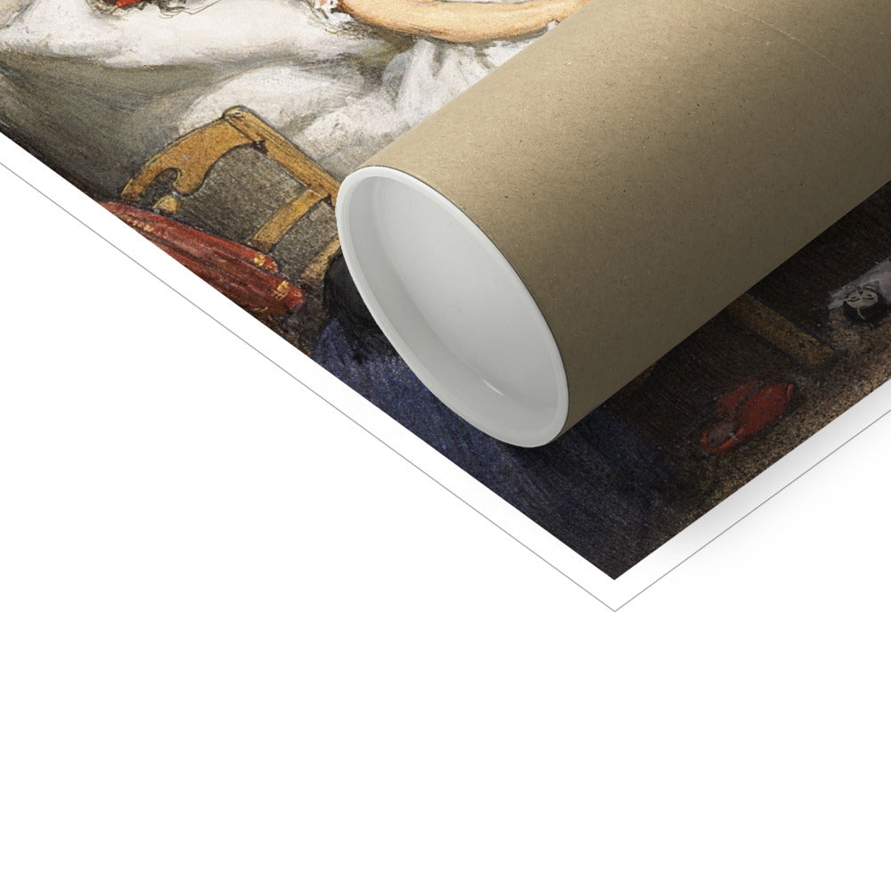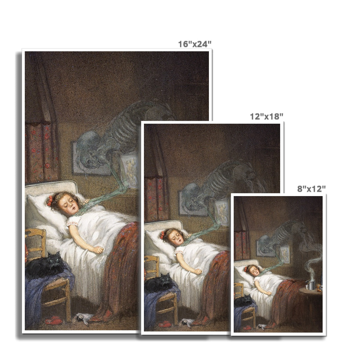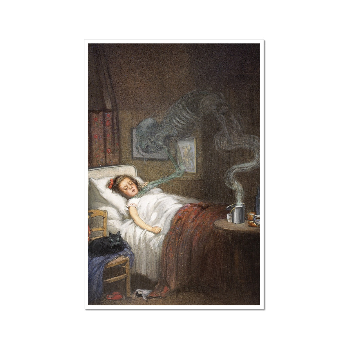 "Ghostly Skeleton Trying to Strangle a Sick Child" by Richard Tennant Cooper, is a haunting portrayal of a spectral figure visiting a young girl as she sleeps. Created in the early 20th century, the artwork embodies a dark, symbolic view of illness and death. The skeleton, representing the specter of disease or death, reaches out with bony fingers to the vulnerable child lying in bed, wrapped in blankets, with an almost peaceful expression, unaware of the looming danger. The ghostly figure is rendered in muted tones that blend with the dimly lit, somber room, amplifying the sense of fear and helplessness.