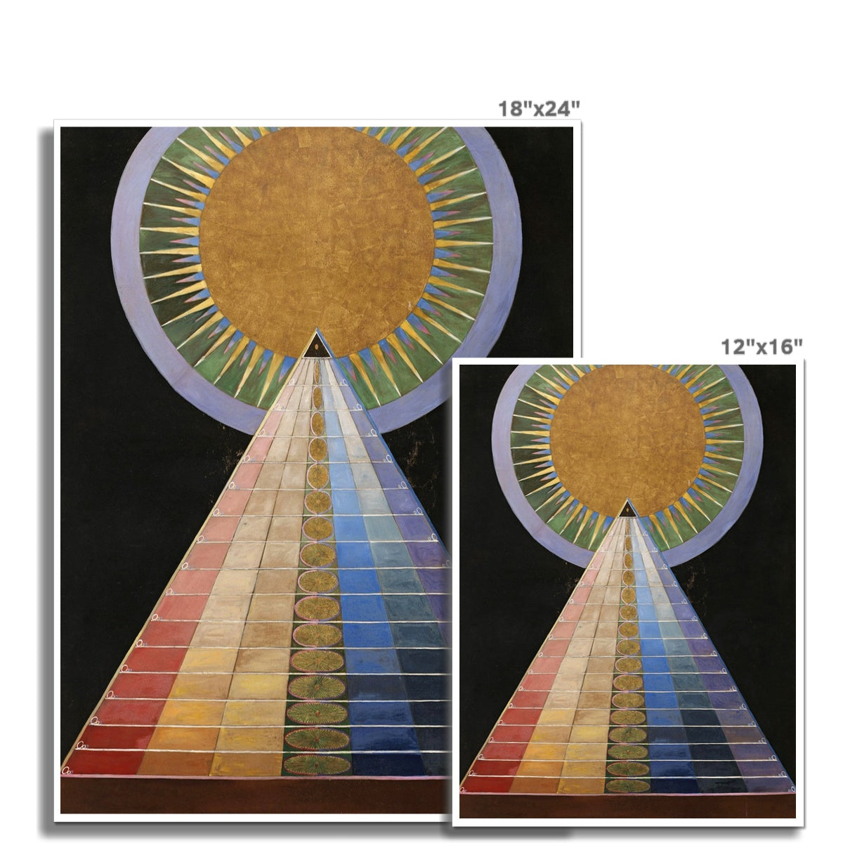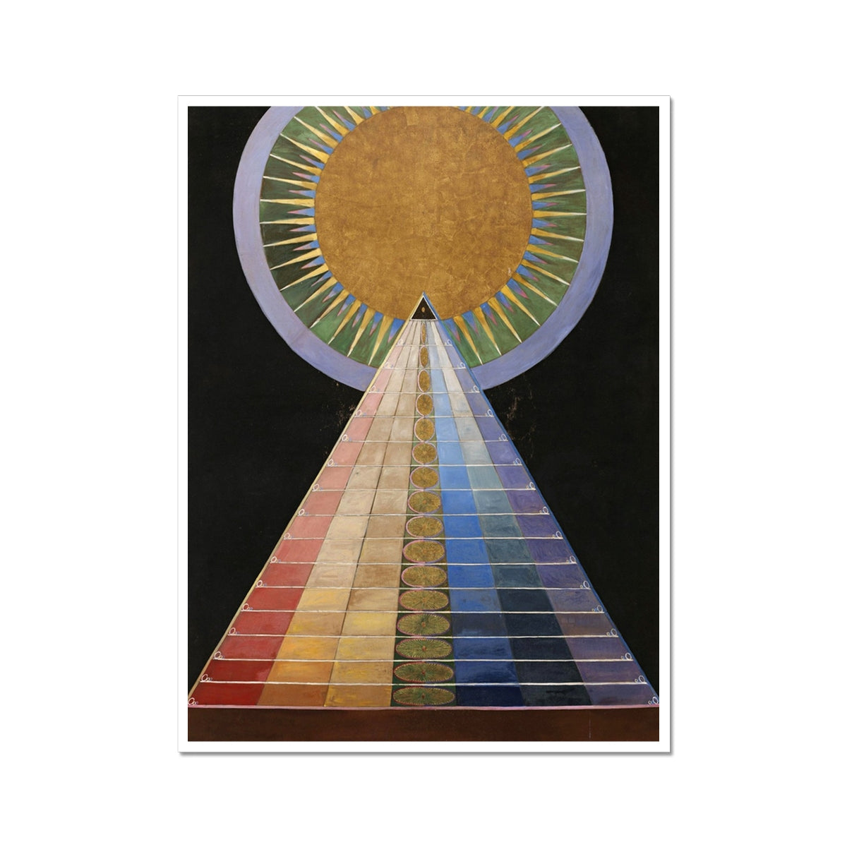 Hilma af Klint’s Group X, No. 1, Altarpieces (1915) is a striking symbolic work that blends spirituality and geometry. A radiant golden circle, resembling a divine sun or halo, hovers above a pyramid composed of layered color bands transitioning from red to blue. Each band contains intricate floral or mandala-like forms, suggesting stages of spiritual evolution. Set against a black background, the composition evokes a mystical ascent toward enlightenment and cosmic unity.