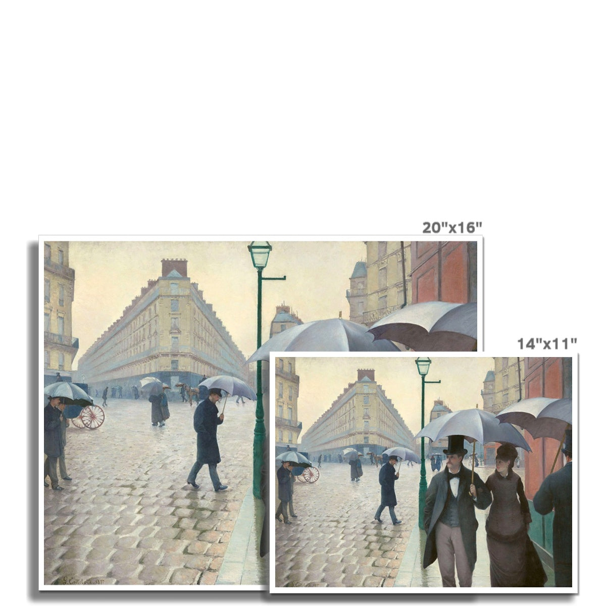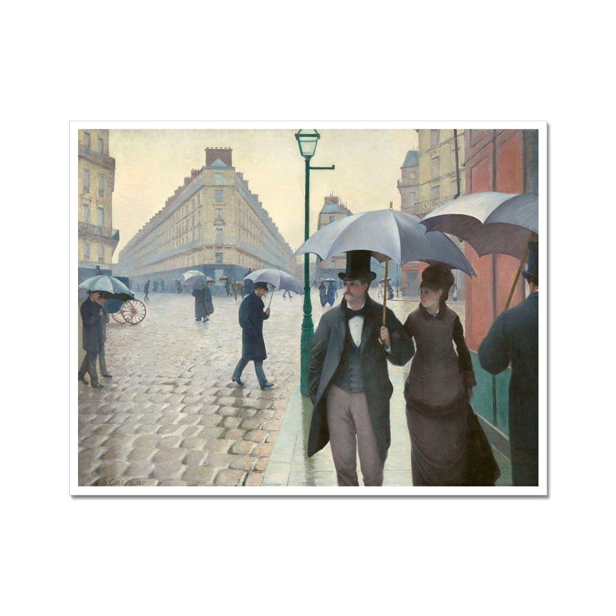 This painting offers an insightful portrayal of modern urban life in 19th century Paris. Set on a broad, rain slicked cobblestone street, it depicts elegantly dressed Parisians navigating the city under umbrellas. Caillebotte’s masterful use of perspective and meticulous realism emphasizes the structured geometry of Haussmann-era architecture and the luminous reflections on the wet pavement. The composition captures both the anonymity and sophistication of city life, seamlessly blending the atmospheric sensibility of Impressionism with the precision of academic technique.