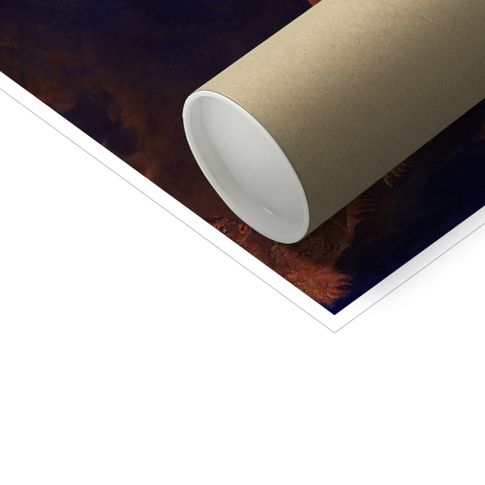 "Hades Carrying Eros to the Underworld" by Richard Westall, created in 1795, depicts a dramatic and mythological scene. In the artwork, Hades, the god of the underworld, is shown carrying Eros, the god of love, through the air. Hades is portrayed as a muscular, winged figure with dark, bat-like wings and a mischievous expression, suggesting his powerful and ominous nature. Eros, in contrast, is depicted as a small, angelic child with delicate wings, holding a bow, a symbol of his role in inspiring love. The dark, shadowy background creates a stark contrast with the luminous figures, highlighting the tension and drama of the scene. The painting captures the classical themes of love and death, as well as the interplay between innocence and darkness, which are central to many mythological narratives. Westall's style emphasizes the emotional intensity of the moment, using dynamic poses and vivid expressions to bring the myth to life.