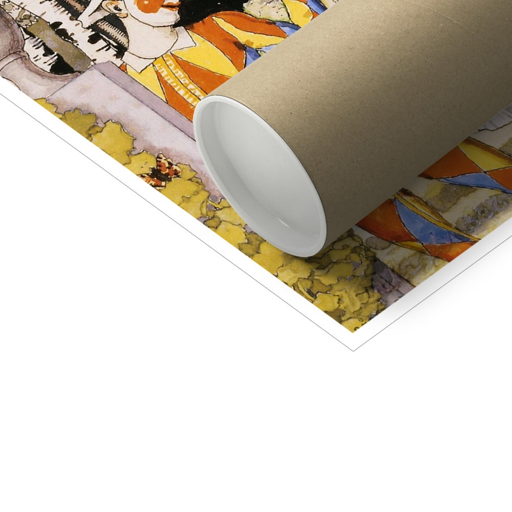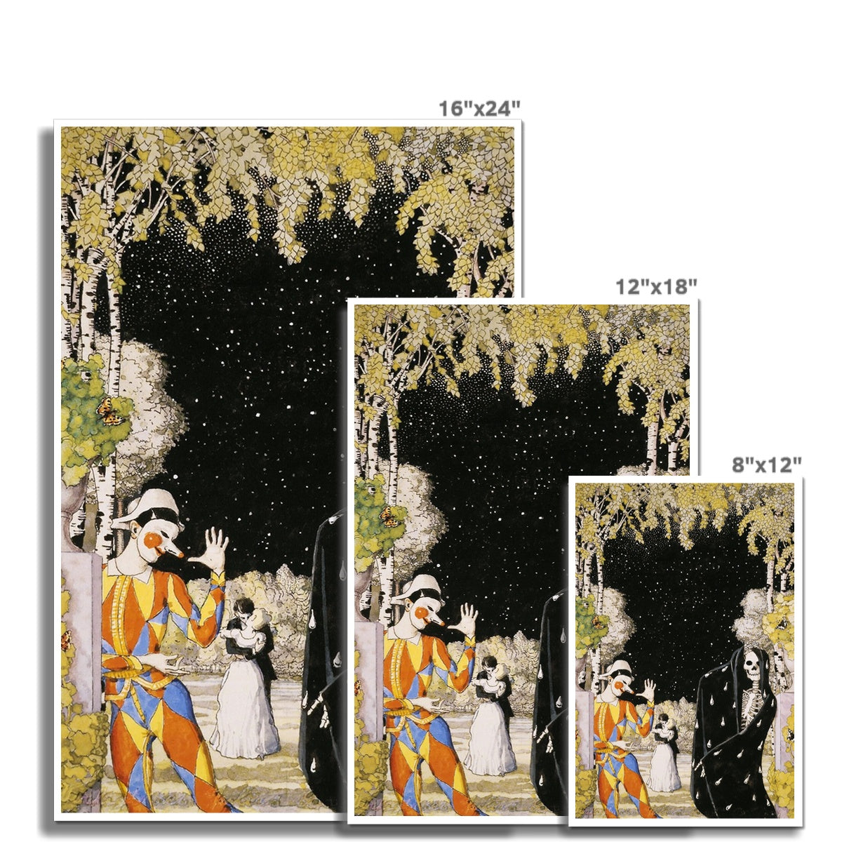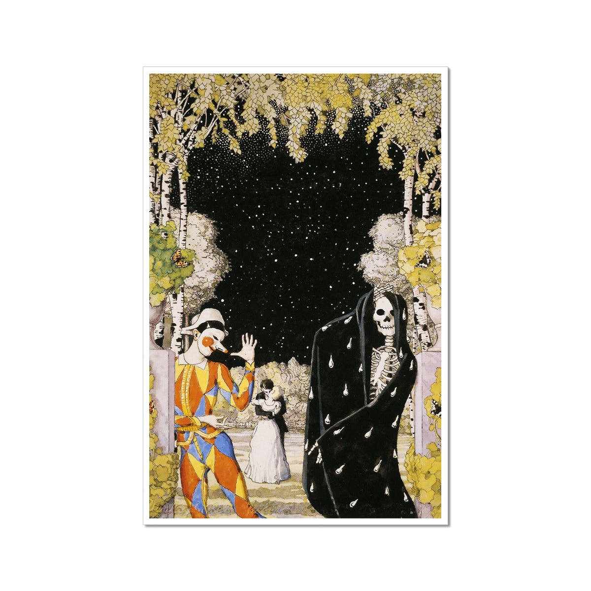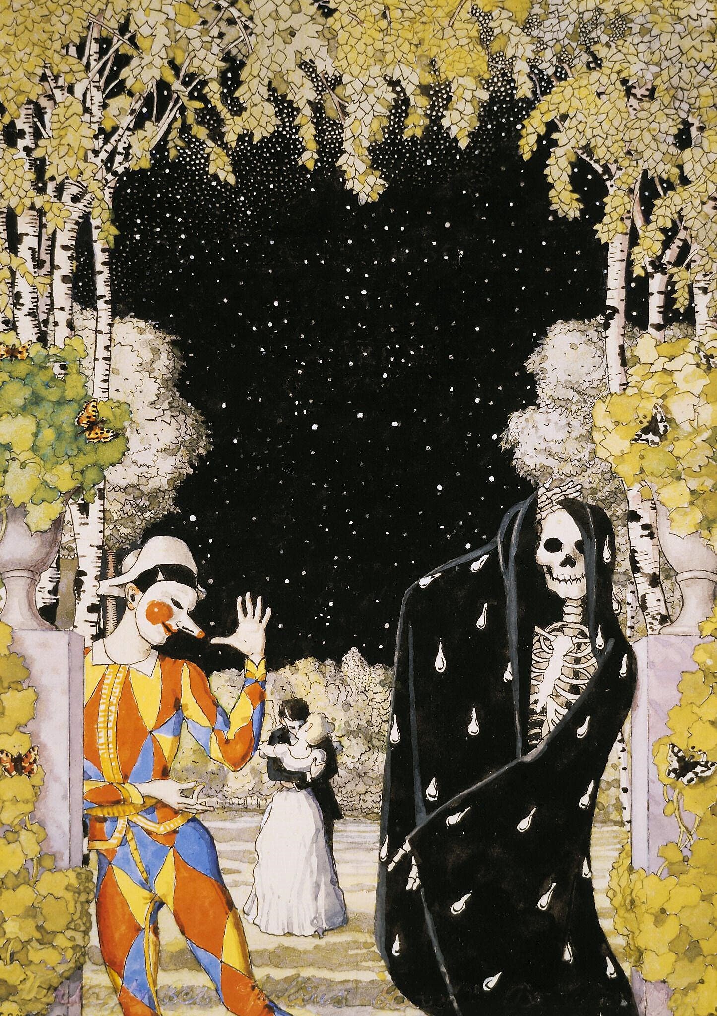 "Harlequin and Death" (1907) by Konstantin Somov is a symbolist painting that contrasts the whimsical and the macabre. The composition features a harlequin in a brightly colored, geometric costume playfully gesturing, juxtaposed against the grim figure of Death, depicted as a skeleton draped in a dark, tear-patterned cloak. The background reveals a romantic couple embracing under a starry night sky, framed by lush trees. The artwork explores themes of life, love, and mortality with an elegant and theatrical aesthetic.