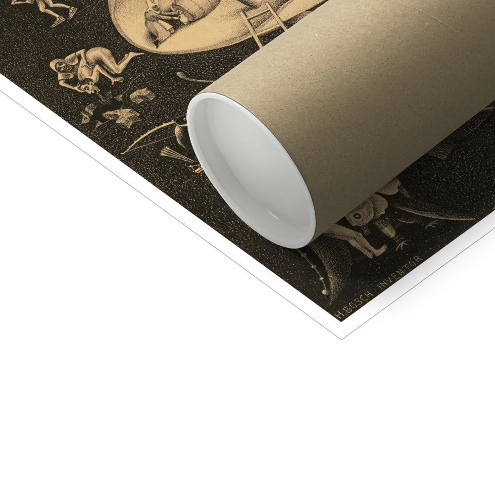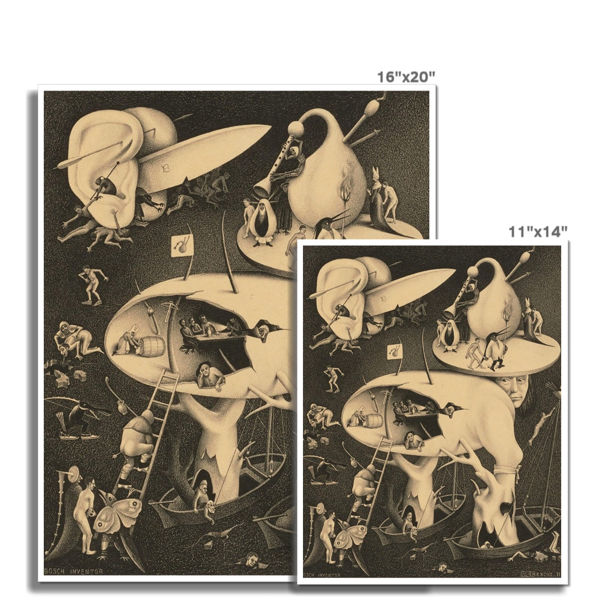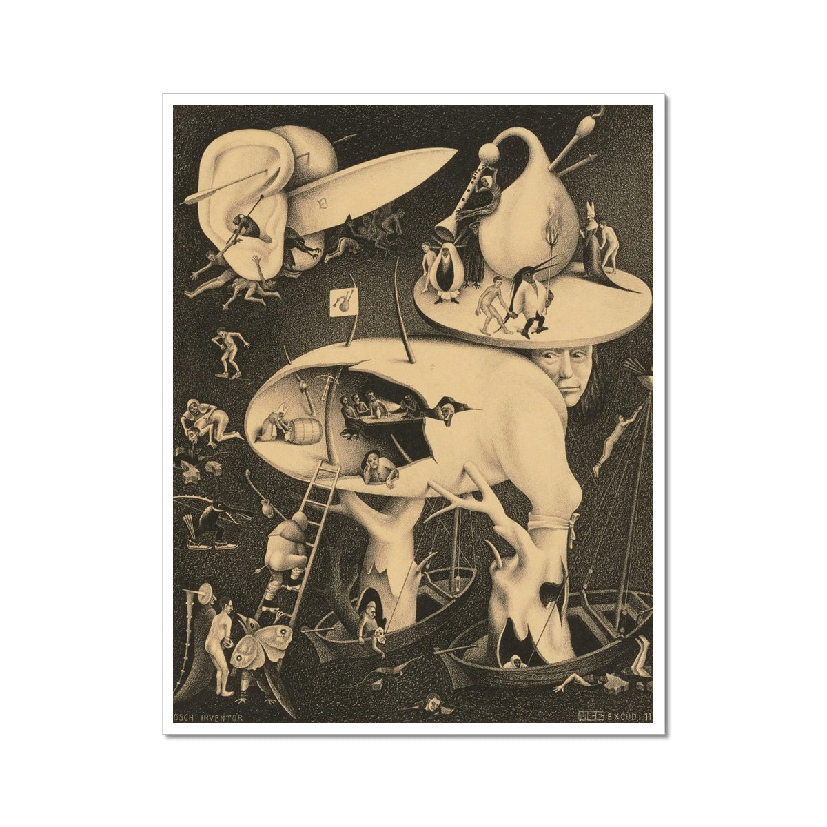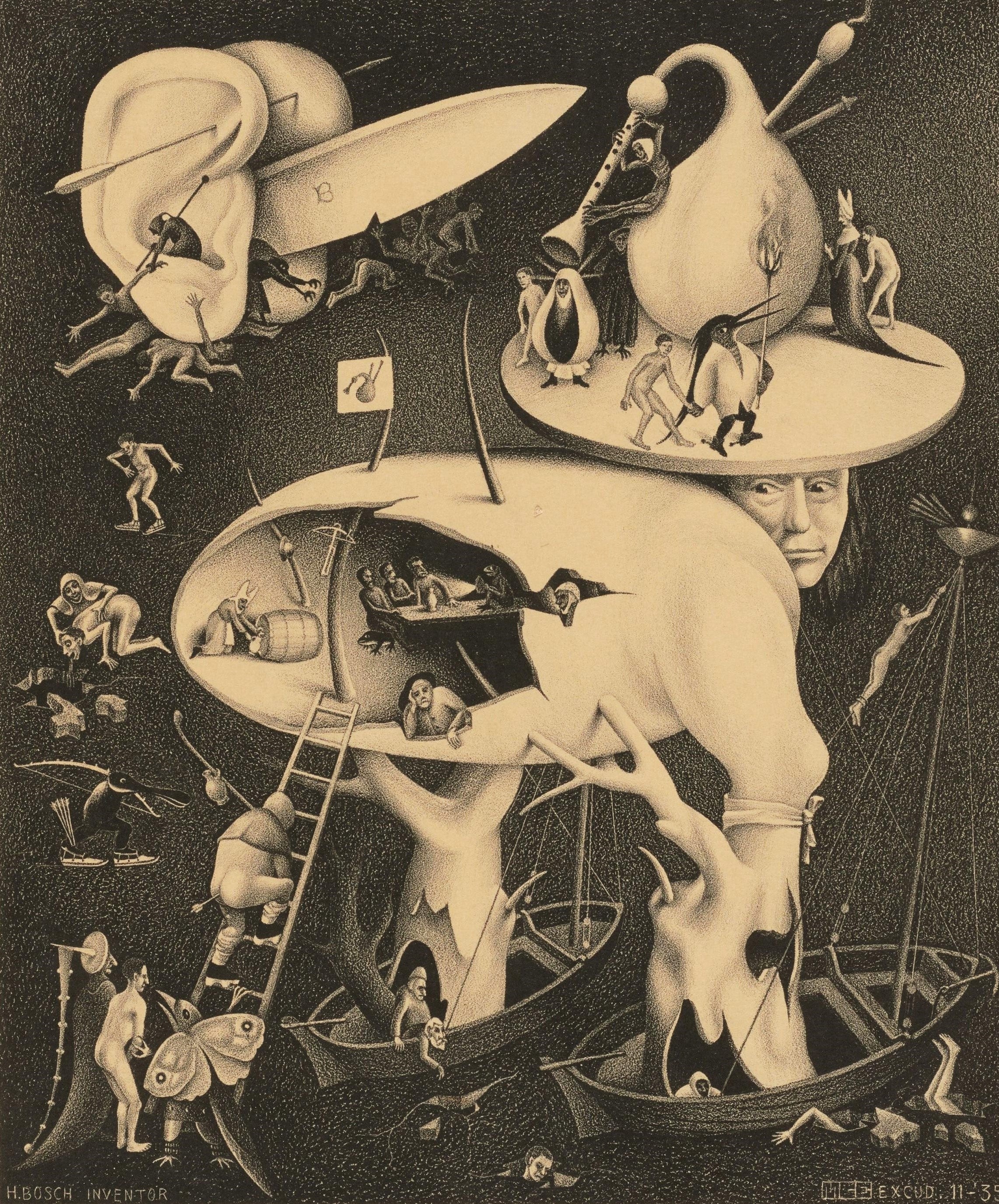 The illustration of "Hell" by M. C. Escher, created in 1935 after Hieronymus Bosch, is a surreal and intricate portrayal of a nightmarish landscape. This black-and-white artwork features a multitude of bizarre and fantastical elements, reminiscent of Bosch's chaotic and imaginative style. Central to the composition are large, distorted human forms intermingled with strange, hybrid creatures. The scene is populated with various figures engaged in grotesque and unsettling activities, creating a sense of confusion and torment. A prominent ear-like structure with a dagger piercing through it stands out on the left, while peculiar instruments and objects appear scattered throughout the image. Escher's detailed and meticulous technique captures the macabre and fantastical essence of Bosch's original vision, presenting a visually striking and haunting depiction of Hell.