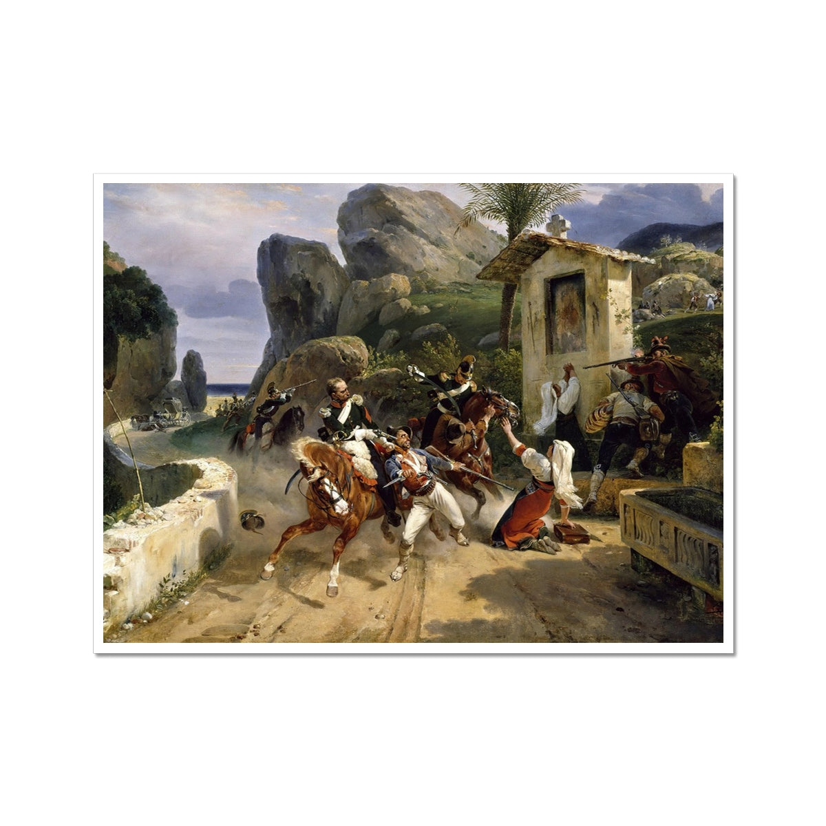 Horace Vernet’s Italian Brigands Surprised by Papal Troops (1831) is a dramatic and dynamic depiction of a violent clash between Italian outlaws and Papal soldiers. Set in a rugged, mountainous landscape, the scene captures the chaos of the ambush with intense movement, expressive gestures, and emotional tension. The painting reflects Vernet’s interest in contemporary historical events and his talent for vivid, cinematic storytelling.