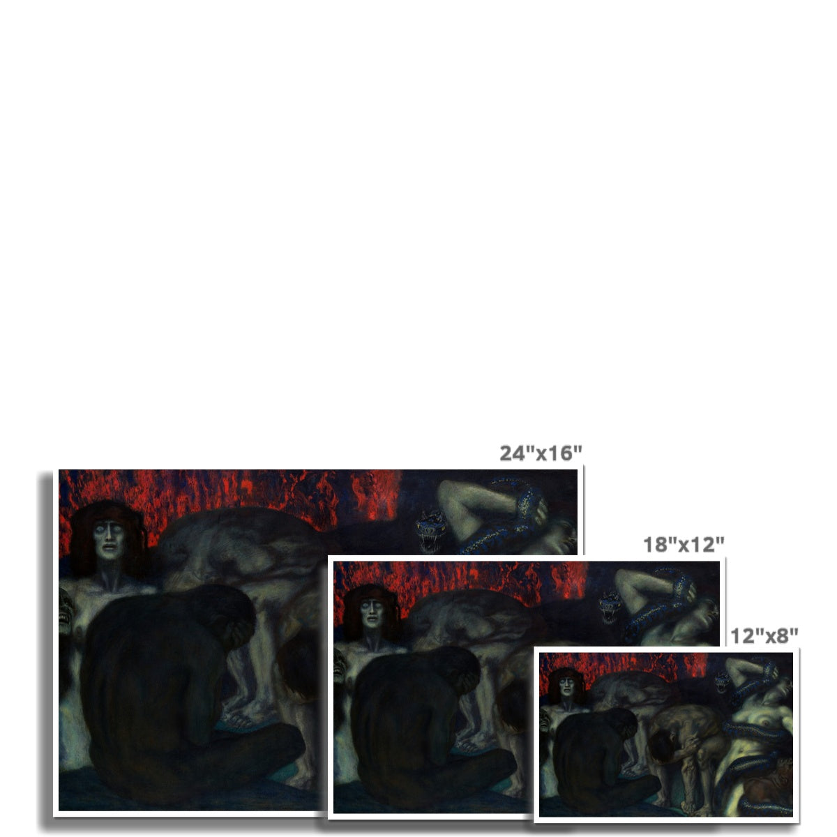 "Inferno" by Franz von Stuck, created around 1908, is a striking depiction of hellish torment and despair. The artwork features a group of figures in various poses of suffering and anguish against a backdrop of fiery red flames. The central figure appears to be looking out at the viewer with a haunting, wide-eyed expression, possibly signifying the horror and eternal pain of the damned. The use of dark colors and intense contrasts with the bright, almost incandescent flames in the background conveys a sense of heat and the bleakness of damnation. The muscular details of the figures, along with the expressions of agony, contribute to the dramatic impact of the scene. The painting resonates with the Symbolist movement's fascination with themes of sin, redemption, and the darker aspects of the human psyche.