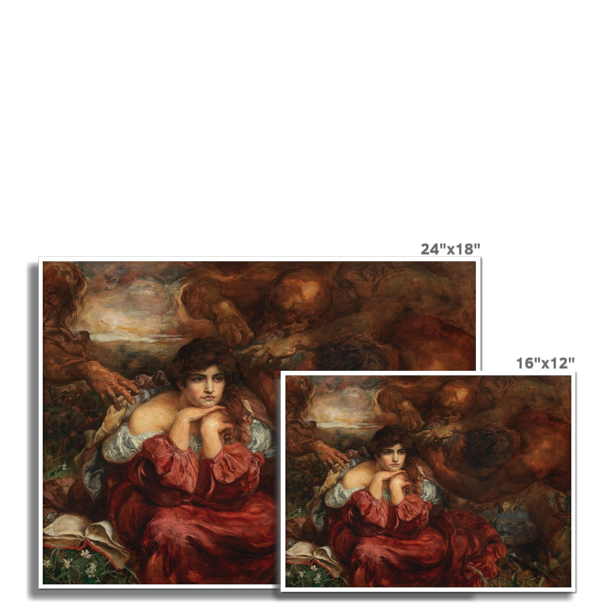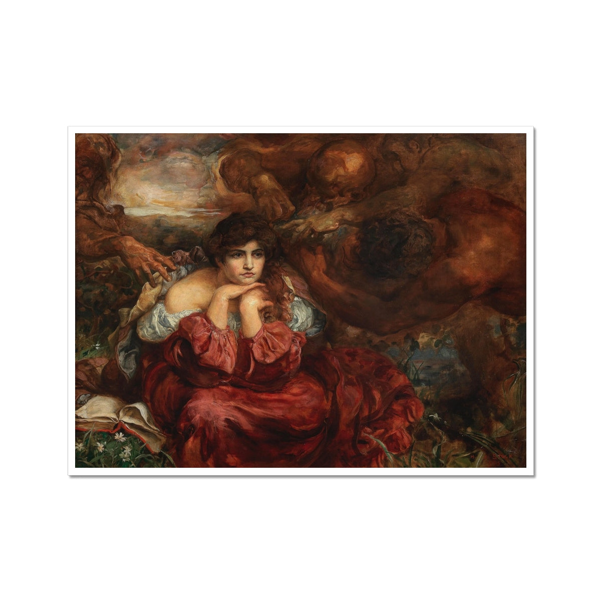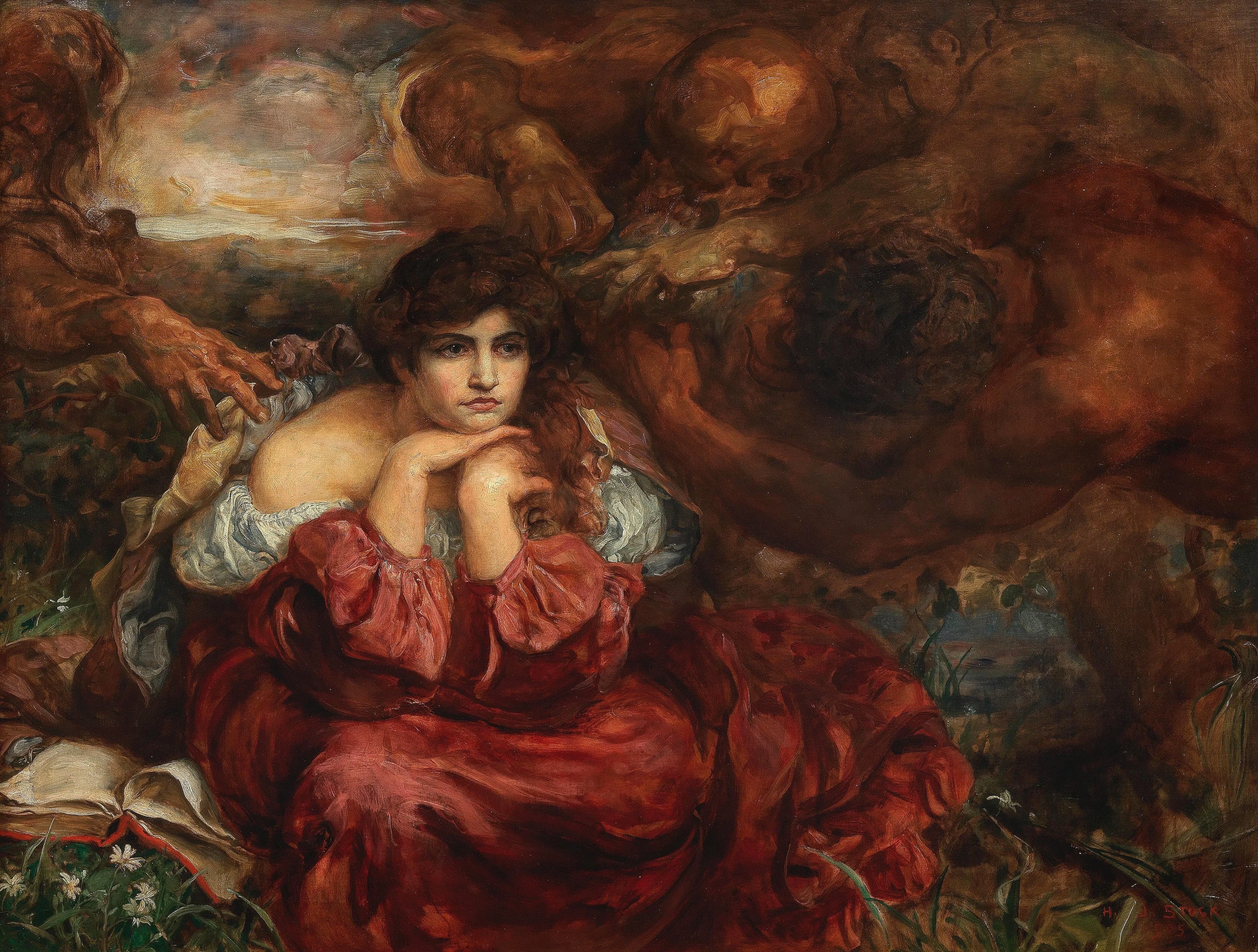 "Influences" (1905) by Henry John Stock is a deeply symbolic and emotive work that explores the inner turmoil of the human mind. The painting features a contemplative young woman surrounded by shadowy, ghost-like figures representing external forces or psychological influences. With rich, dark tones and dramatic contrasts, Stock captures the tension between thought and emotion, isolation and intrusion.