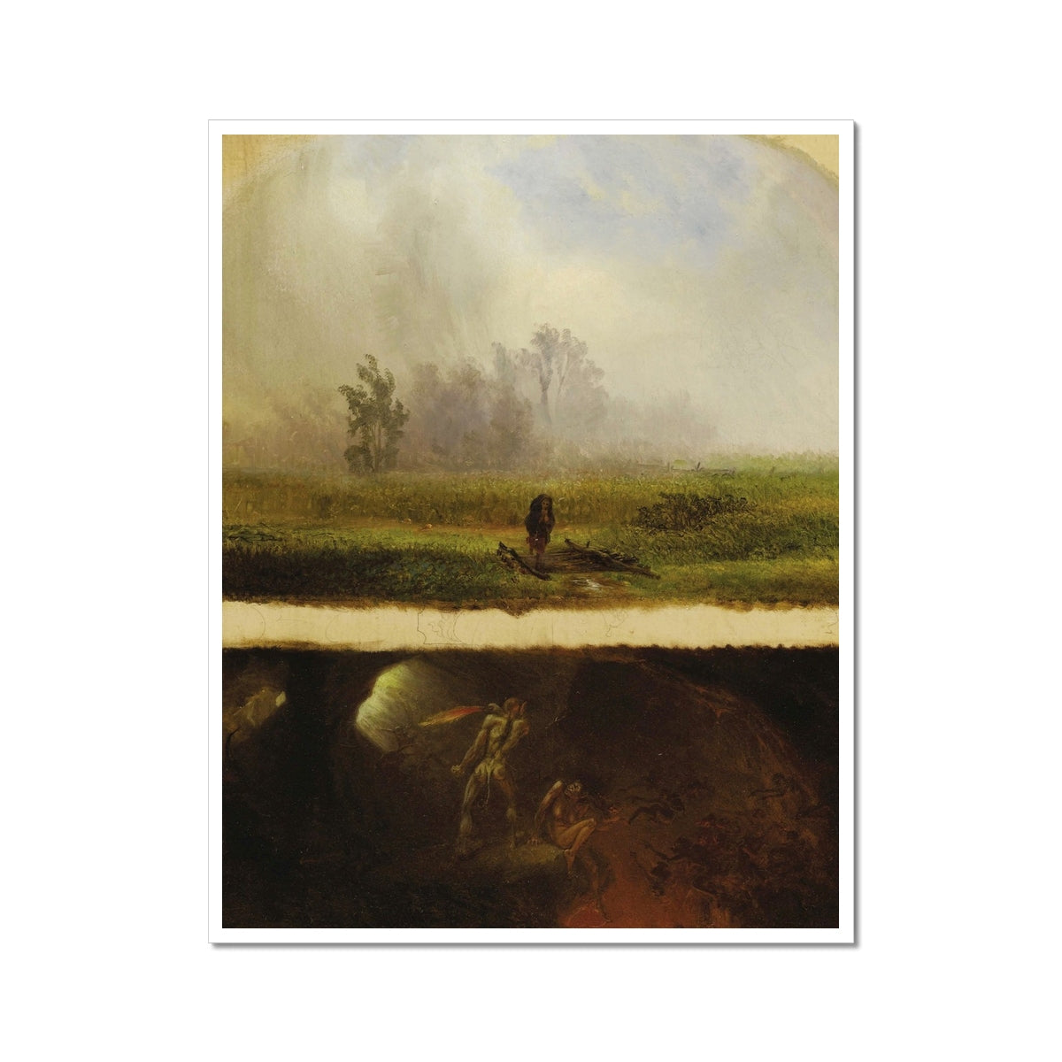 "It Rains it Shines, the Devil Whipping his Wife" by William Holbrook Beard depicts a striking contrast between the serene surface world and the chaotic underworld. In the upper half of the painting, there is a tranquil rural landscape with a figure walking through a field under a cloudy sky, suggesting a peaceful, everyday scene. The colors are soft and natural, contributing to the calm atmosphere.