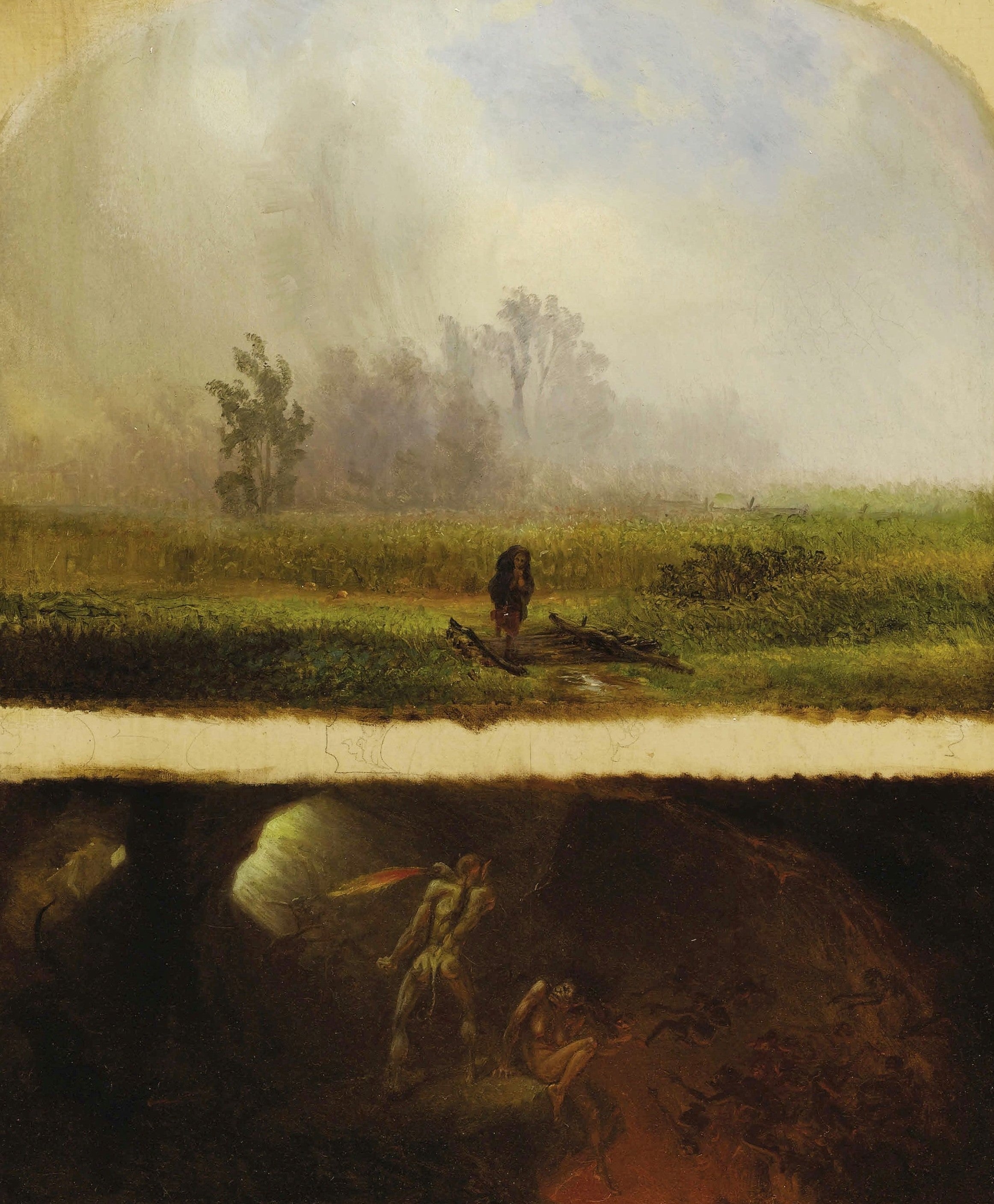 The juxtaposition of these two scenes within a single painting creates a dramatic effect, highlighting the dichotomy between the peaceful, idyllic world above and the hellish chaos below. This composition reflects the 19th-century fascination with the moral and physical contrasts in life and the afterlife, a common theme in Beard's work.