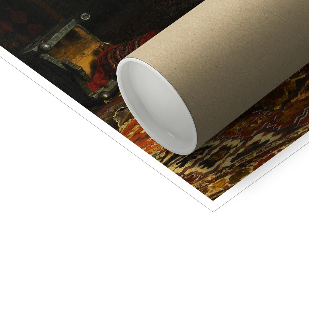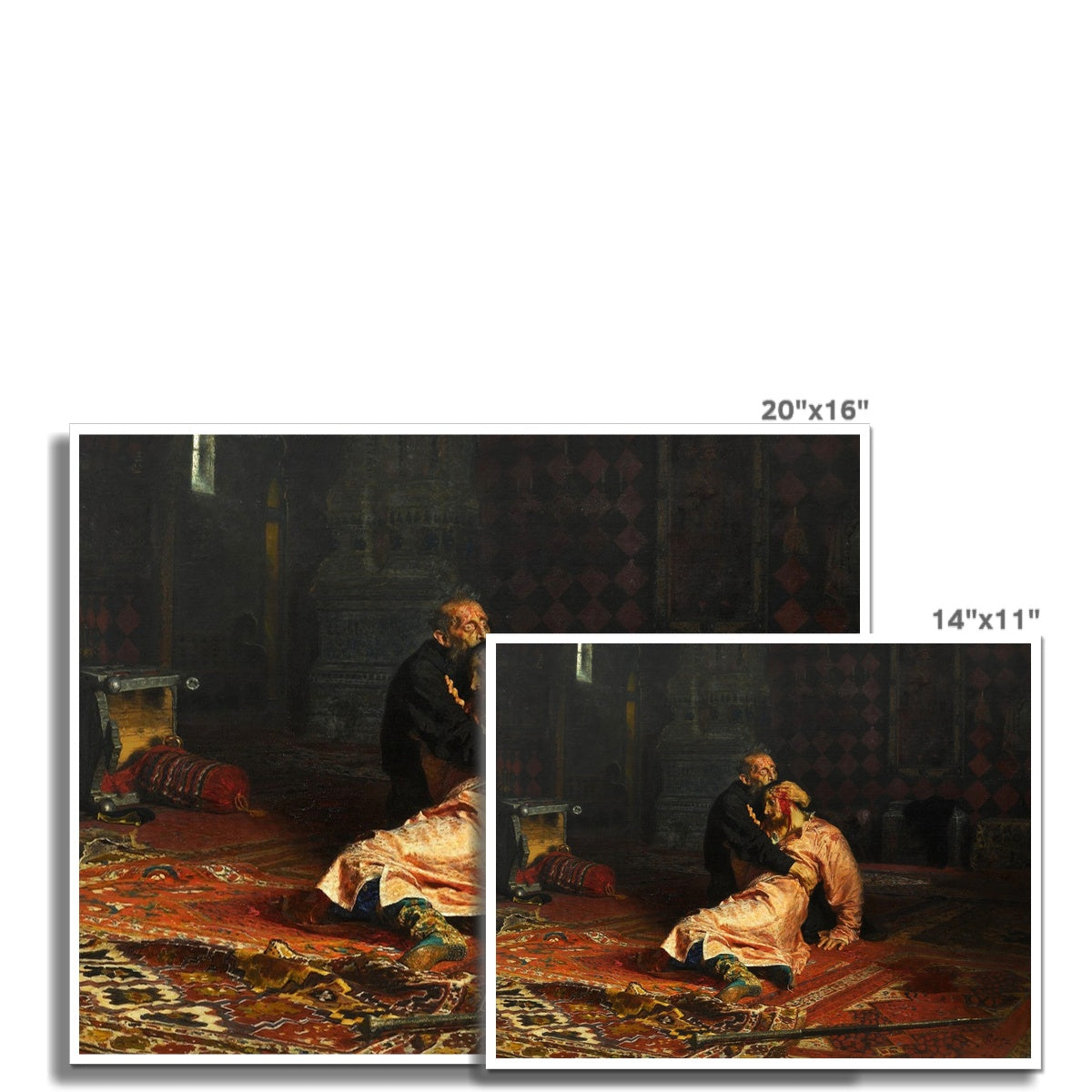 Ivan the Terrible and His Son Ivan (1885) by Ilya Repin, depicts a moment of intense emotional and physical turmoil. It portrays the aftermath of Tsar Ivan IV striking his son Ivan Ivanovich in a fit of rage, resulting in his fatal injury. The scene is imbued with raw emotion: the father's anguished expression and protective grasp contrasts with the lifeless form of his son. The richly detailed setting, including the ornate carpet and dim interior, enhances the gravity of the tragic event. Repin's use of chiaroscuro and precise detail draws the viewer into this hauntingly intimate and historically charged narrative.