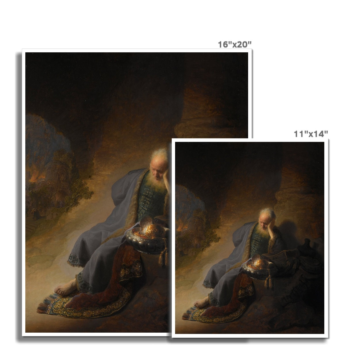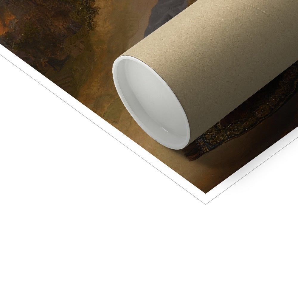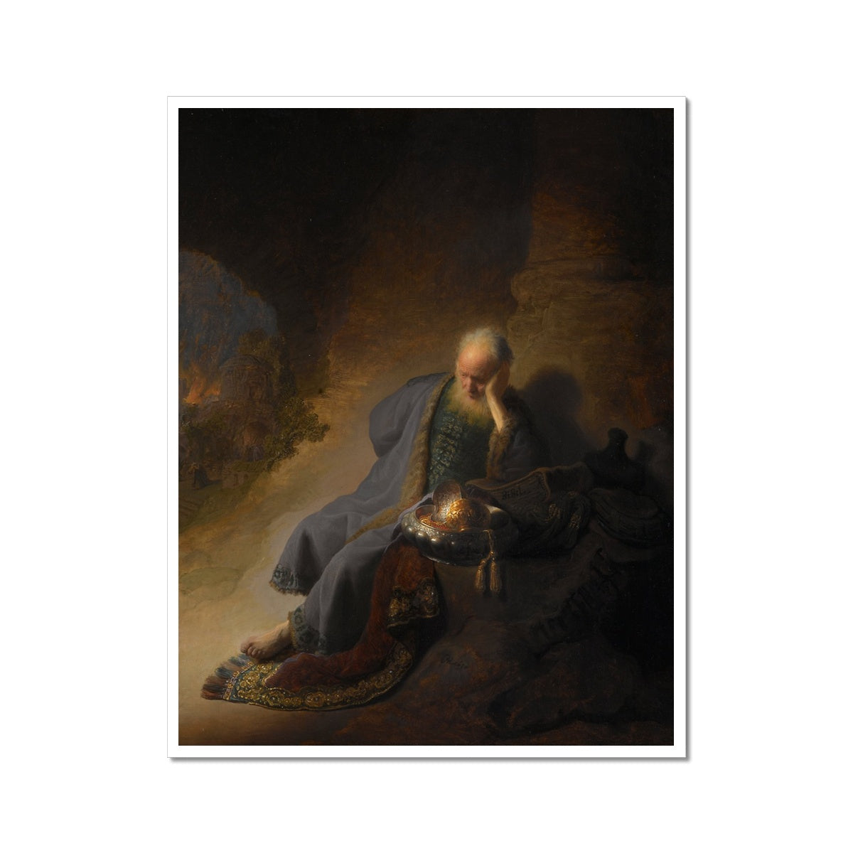 "Jeremiah Lamenting the Destruction of Jerusalem" is a painting by Dutch Baroque master Rembrandt. It depicts the Biblical figure of Jeremiah, the prophet who mourned the destruction of Jerusalem by the Babylonians in 586 BCE. The painting is characterized by Rembrandt's dramatic use of light and shadow, with the contrasts of light and dark adding to the sense of intense emotion in the scene. The figure of Jeremiah is depicted with a powerful sense of movement, as if he is writhing in pain and sorrow. The intricate details of his clothing and the furrowed lines of his face add to the sense of realism and emotional depth in the painting. Rembrandt's use of color is also noteworthy, with the warm, golden tones of Jeremiah's clothing and skin contrasting against the cool, shadowy background. "Jeremiah Lamenting the Destruction of Jerusalem" is considered one of Rembrandt's masterpieces and is widely recognized as a powerful example of Baroque art.