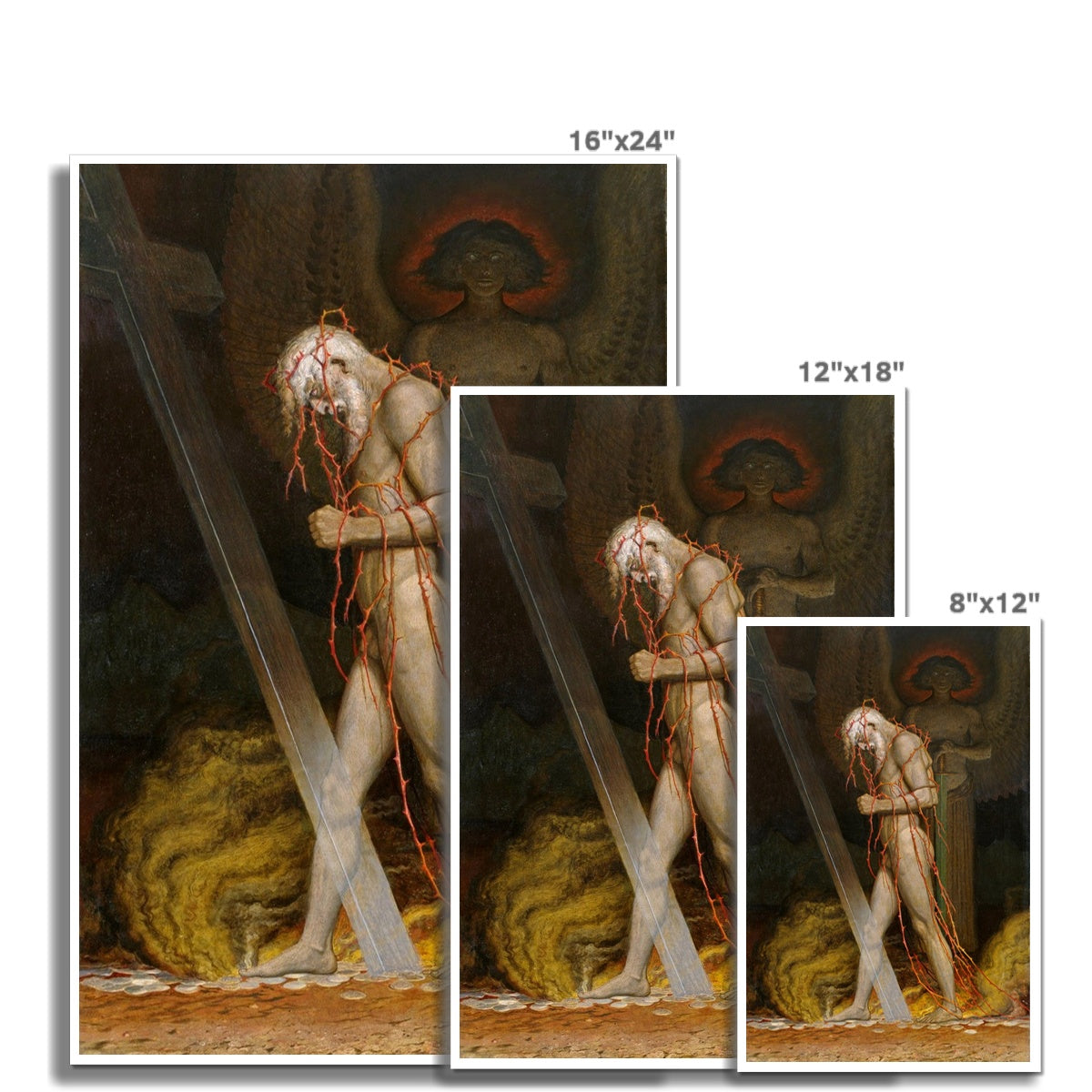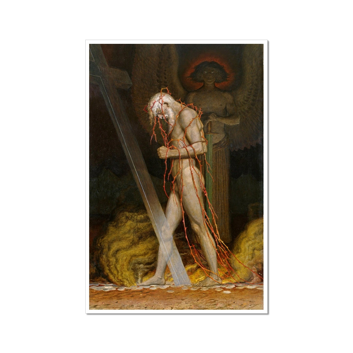 "Judas Iscariot" by Sascha Schneider, painted circa 1908, is an evocative and dark piece of art that portrays a powerful scene. The painting depicts Judas, the infamous betrayer of Jesus Christ, in a moment of torment and despair. He is shown naked, walking while bound and entwined by thorny branches that seem to both restrain and punish him. His posture is one of defeat and anguish, his head bowed and his expression sorrowful.