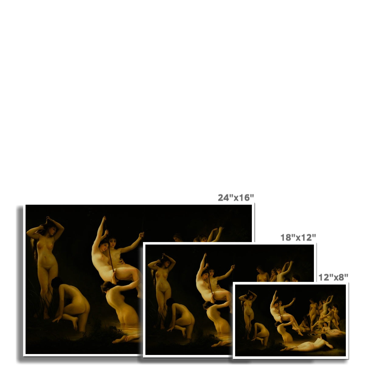 The painting "Les Nymphes" by Luis Ricardo Falero, created in approximately 1878, depicts a group of nymphs engaging in various activities in a nocturnal, serene landscape. The scene is set by a body of water, illuminated by a subtle light that reflects off the water's surface and highlights the figures. The nymphs are portrayed in different poses: some are standing, others sitting or reclining, and one is playfully perched on another's shoulders. Their interactions suggest a sense of camaraderie and ease within their natural surroundings. The composition is balanced, with the figures arranged in a way that guides the viewer's eye across the canvas. The painter's skill is evident in the rendering of the human form, the play of light on skin, and the overall tranquil atmosphere that is both idyllic and sensuous. Falero's attention to detail and ability to capture the mythical quality of these figures are central to the painting's aesthetic and thematic essence.