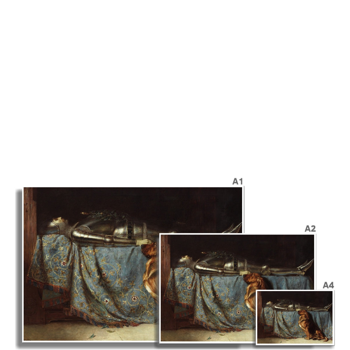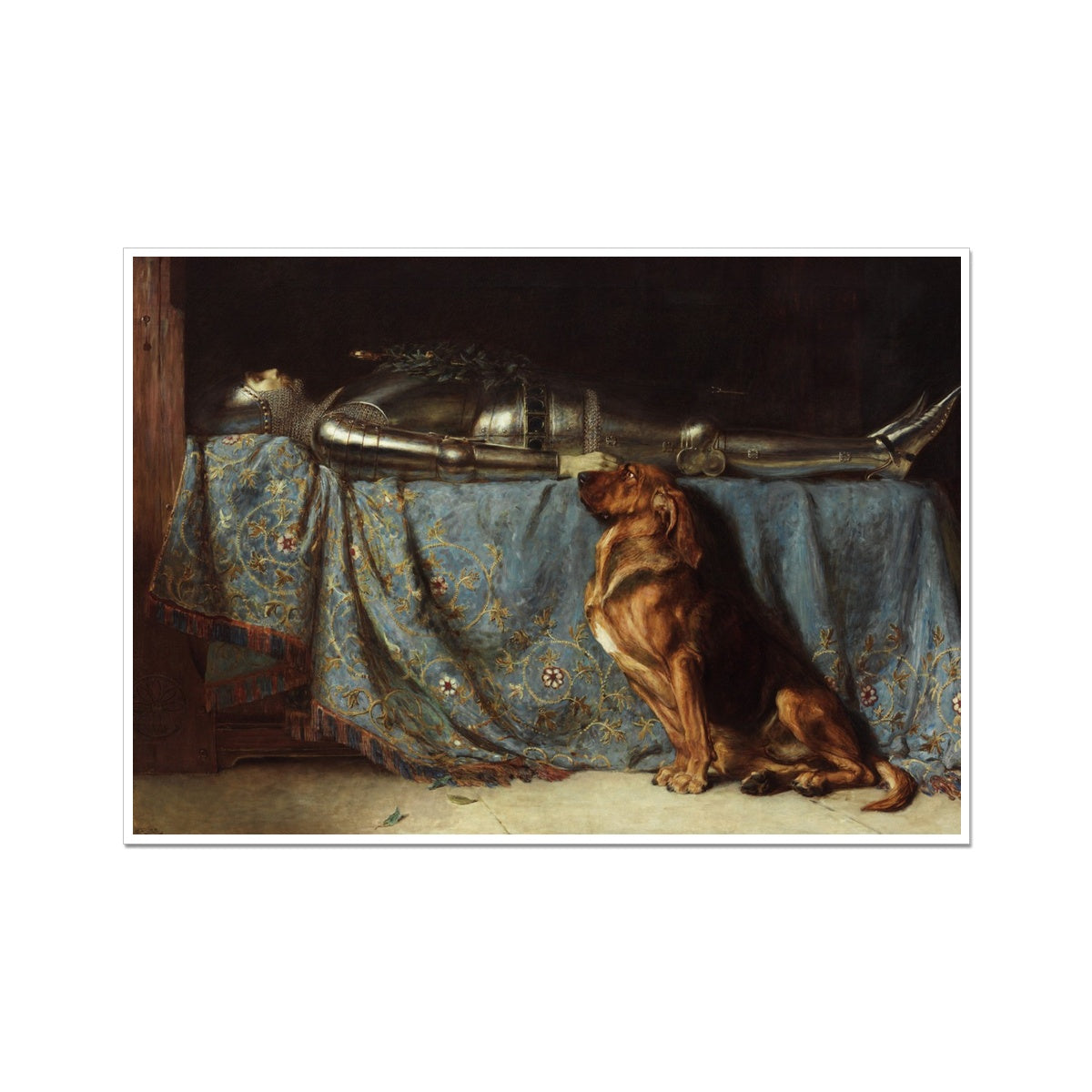 The original Latin title of this painting is "Requiescat", which roughly translates to 'Let Him Rest' in English. This an oil on canvas painting by British artist Briton Rivière completed in 1888. The painting depicts an armoured medieval knight lying atop a bed with a blue floral sheet. A dog (often identified as a bloodhound) sits besides the bed while observantly looking towards the face of the knight on whom a wreath placed, indicating death. The expression of the dog is potentially explained by the title of the painting.