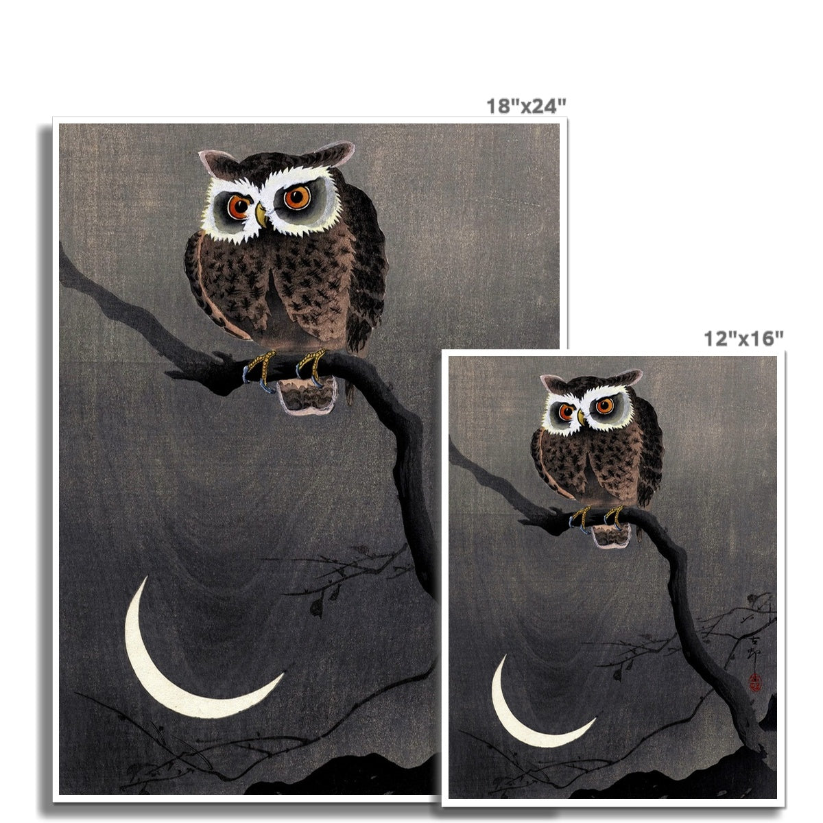 In this refined woodblock print, Ohara Koson depicts a long eared owl perched silently on a bare branch beneath a crescent moon. Rendered with delicate precision and subtle tonal gradations, the owl’s alert gaze and softly patterned plumage contrast with the spare, nocturnal landscape. The composition exemplifies Koson’s mastery of kacho-ga (bird-and-flower imagery), evoking stillness, solitude, and the quiet poetry of nature at night.