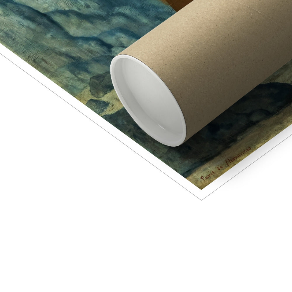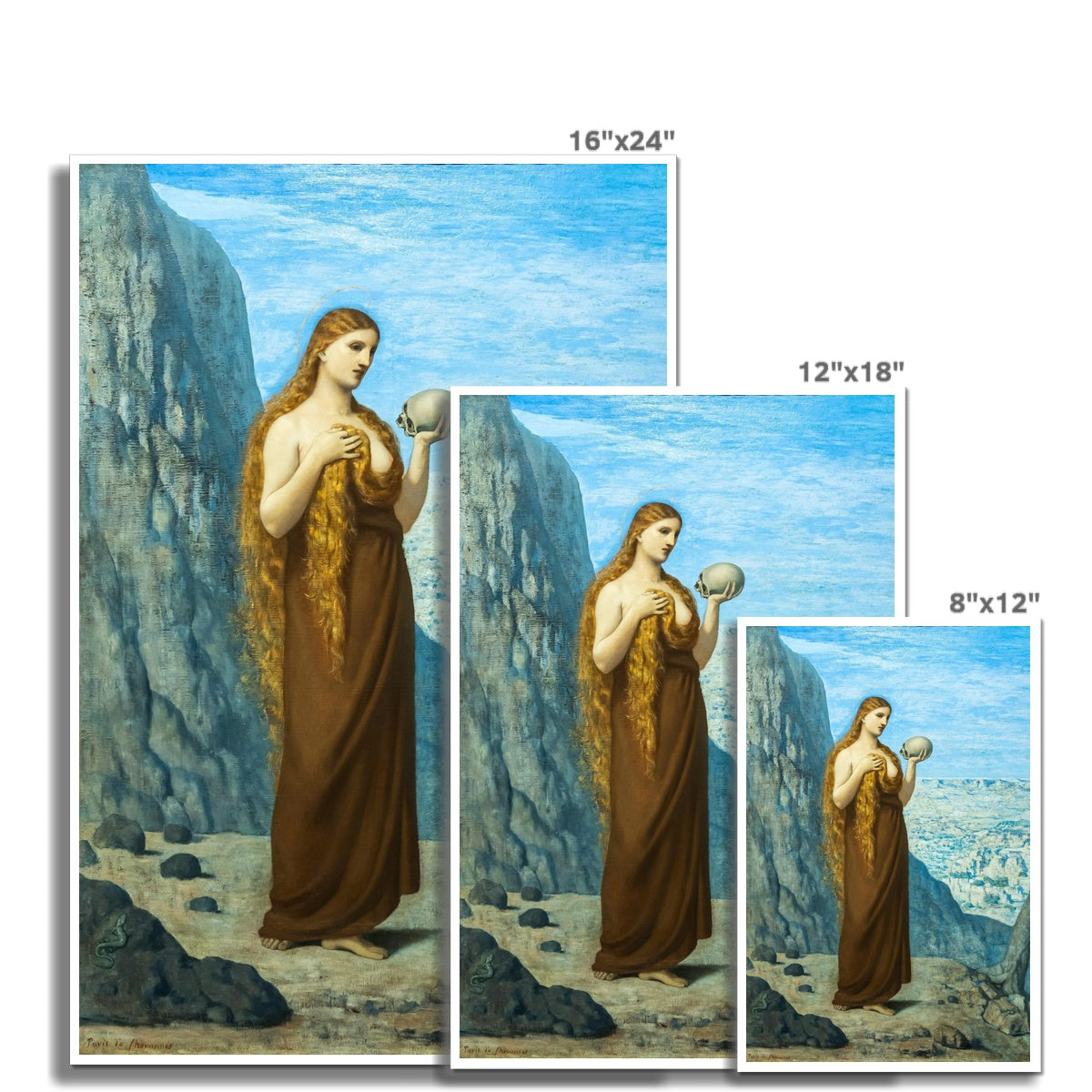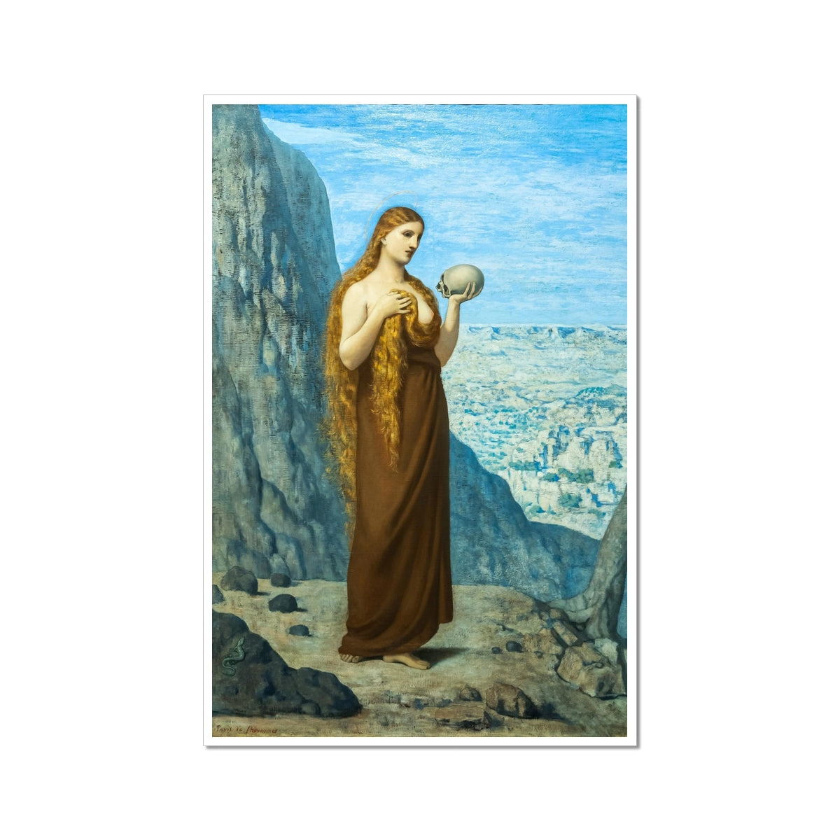Pierre Puvis de Chavannes' painting Mary Magdalene in the Desert (1870) portrays Mary Magdalene as a solitary, contemplative figure in a barren landscape. She stands barefoot, draped in a simple brown garment, with her long, flowing hair falling over her shoulders. In her left hand, she holds a skull, symbolizing mortality and repentance, while her right hand rests on her chest in a gesture of introspection. The arid, rocky setting emphasizes her isolation and spiritual devotion. A small snake at her feet adds a symbolic reference to sin and redemption. The painting’s muted palette and soft lines evoke a sense of solemnity and introspection.